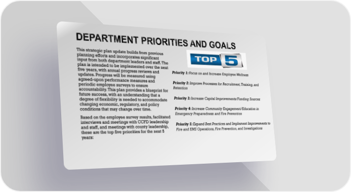 DEPARTMENT PRIORITIES AND GOALS This strategic plan update builds from previous planning efforts and incorporates significant input from both department leaders and staff. The plan is intended to be implemented over the next five years, with annual progress reviews and Priority 1: Focus on and Increase Employee Wellness updates. Progress will be measured using agreed-upon performance measures and Priority 2: Improve Processes for Recruitment, Training, and periodic employee surveys to ensure Retention accountability. This plan provides a blueprint for future success, with an understanding that a Priority 3: Increase Capital Improvements/Funding Sources degree of flexibility is needed to accommodate changing economic, regulatory, and policy conditions that may change over time. Priority 4: Increase Community Engagement/Education in Based on the employee survey results, facilitated Emergency Preparedness and Fire Prevention interviews and meetings with CCFD leadership Priority 5: Expand Best Practices and Implement Improvements to and staff, and meetings with county leadership, Fire and EMS Operations, Fire Prevention, and Investigations these are the top five priorities for the next 5 years: