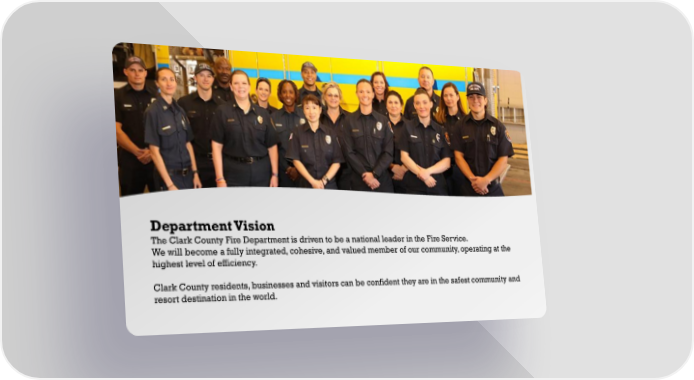 Department Vision The Clark County Fire Department is driven to be a national leader in the Fire Service. We will become a fully integrated, cohesive, and valued member of our community, operating at the highest level of efficiency. Clark County residents, businesses and visitors can be confident they are in the safest community and resort destination in the world.