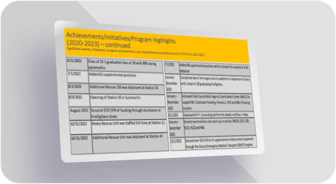 Achievements/Initiatives/Program Highlights (2020-2023) – continued Significant events, milestones, program achievements, and operational accomplishments for CCFD from 2022-2023 3/21/2022 Class of 22-1 graduated class of 18 with 89% being 7/1/2023 Added 40 supplemental positions which included the creation of a 5th paramedics battalion 7/1/2022 Added 62 supplemental positions January - Completed two of the largest recruit academies in department history December with a total of 129 graduating firefighters. 8/2/2022 Additional Rescue 233 was deployed at Station 33 2023 8/9/2022 Opening of Station 35 in Summerlin January – Activated Clark County Multi-Agency Coordination Center (MACC) to December support Mt. Charleston Flooding, Formula 1, NYE and UNLV Shooting August 2022 Secured $757,979 of funding through Assistance to 2023 Incident. Firefighters Grant 8/1/2023 Deployed NVTF-1 providing aid from the deadly wildfires in Maui. 10/31/2022 Heavy Rescue Unit was staffed full time at Station 21 January – Several new frontline units were put in service: EMS33, E215, E30, December R215, R223 and R66. 10/31/2022 Additional Rescue Unit was deployed at Station 24 2023 12/1/2023 Secured over $23 million of supplemental reimbursement payments through the Ground Emergency Medical Transport (GEMT) Program.