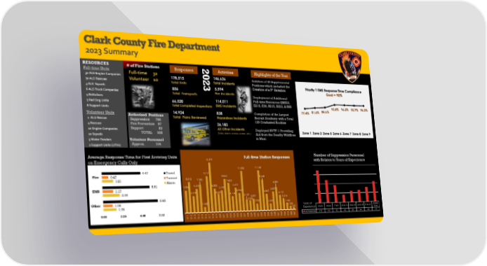 Clark County Fire Department 2023 Summary RESOURCES # of Fire Stations Responses 2023 Activities Highlights of the Year Full-time Units Full-time 32 30 ALS Engine Companies Volunteer 10 178,515 146,626 Addition of 40 Supplemental 30 ALS Rescues Total Units Total Incidents Positions which included the Priority 1 EMS Response Time Compliance th 3 ALS Squads 856 5,594 Creation of a 5 Battalion Goal = 90% 6 ALS Truck Companies Total Transports Fire Incidents Deployment of Additional 4 Battalions 66,520 114,011 Full-time Resources EMS33, 5 Red Dog Units Total Completed Inspections EMS Incidents E215, E30, R215, R223, & R66 95.8% 96.2% 95.7% 96.3% 6 Support Units 77.4% 81.6% 84.6% Volunteer Units 14,924 838 Completion of the Largest Authorized Positions Total Plans Reviewed Hazardous Incidents Recruit Academy with a Total 1 ALS Rescue Suppression 766 129 Graduated Rookies 4 Rescues Fire Prevention 87 26,183 10 Engine Companies Support 83 All Other Incidents Deployed NVTF-1 Providing Zone 1 Zone 2 Zone 5 Zone 6 Zone 7 Zone 8 Zone 9 10 Squads TOTAL 936 (false alarm, smoke scares, etc.) Aid from the Deadly Wildfires 5 Water Tenders Volunteer Personnel in Maui 2 Support Units (UTVs) Approx. 104 Average Response Time for First Arriving Units Full-time Station Responses Number of Suppression Personnel on Emergency Calls Only 13,379 with Relates to Years of Experience 11,035 11,148 4:47 Travel 9,717 Fire 0:47 Turnout 8,212 8,863 8,448 1:21 Alarm 7,380 7,810 6,410 6,384 5:51 5,886 6,337 6,303 5,790 EMS 1:17 4,946 4,567 5,201 2:04 4,419 4,869 4,114 4,132 3,128 3,307 3,216 6:48 2,939 1,920 Other 1:08 1,428 1,839 1,940 1:34 1,035 Years of 22 and 635 Experience 0 to 3 4 to 6 7 to 9 10 to 12 13 to 15 16 to 18 19 to 21 Over 0:00 2:24 4:48 7:12 11 12 13 14 15 16 17 18 19 20 21 22 23 24 25 26 27 28 29 30 31 32 33 34 35 38 61 65 66 76 85 87 # of Personnel 172 121 92 40 60 64 80 111 S S S S S S S S S S S S S S S S S S S S S S S S S S S S S S S S