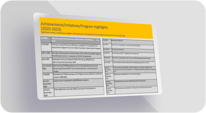 Achievements/Initiatives/Program Highlights (2020-2023) Significant events, milestones, program achievements, and operational accomplishments for CCFD from 2020-2021 2/7/2020 Board of County Commissioners ratified John C. Steinbeck as Fire 1/8/2021 Opening of Station 61 Chief 2/24/2020 CCFD was reclassified to an ISO Class 1 rating for it's exemplary fire 3/4/2021 Class of 20-2 Graduated 21-member rookie firefighters suppression program from the Public Protection Classification Program 5/26/2021 Opening of Station 30 March 2020 Emergency Declaration and Activation of the Clark CountyMuti-Agency 8/29/2021 35 members of NVTF-1 deployed to Hurricane Ida Coordination Center in response to COVID-19 pandemic 10/4/2021 Class of 21-1 graduated rookie class, with 60% graduating as paramedics May 2020 Deployed Community Based COVID-19 testing, 490,000 tests administered by December 2020 11/1/2021 Fire Prevention Division returned from Building Department to CCFD July-October Administered 8 FEMA Deployments of Nevada Urban Search and January - CCFD partnered with SNHD and other agencies to continue mitigation and 2020 Rescue Task Force (NVTF-1) to natural disasters in Louisiana and December response to the COVID-19 pandemic, including expanded testing and vaccination Oregon 2021 sites 7/6/2020 Awarded the FY20 Assistnace to Firefighters Grant (AFG) for COVID-19 January - Suppression responded to 152,262 total incidents support ($469,462) December January- Suppression responded to 126,706 total incidents 2021 December January - Training Division oversaw 260,070 personnel training hours 2020 December 2021 January- Training Division oversaw 280,171 personnel training hours January - Fire Prevention conducted 61,524 inspections and 9,425 plan reviews December December 2020 2021