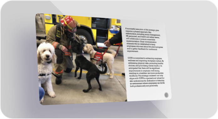A successful execution of this strategic plan requires a phased approach. Key stakeholders, including senior management, HR personnel, and health and safety teams, will collaborate to ensure a seamless implementation. Clear communication channels will be established to keep employees informed about the plan's progress and to gather feedback for continuous improvement. CCFD is committed to enhancing employee wellness and improving workplace culture. By addressing physical risks, promoting healthy choices, and prioritizing mental health, it is anticipated that there will be significant improvements in employee well-being, resulting in a healthier and more productive workforce. This strategic endeavor not only aligns with CCFD’s organizational values but also underscores the dedication to fostering an environment where employees can thrive both professionally and personally.