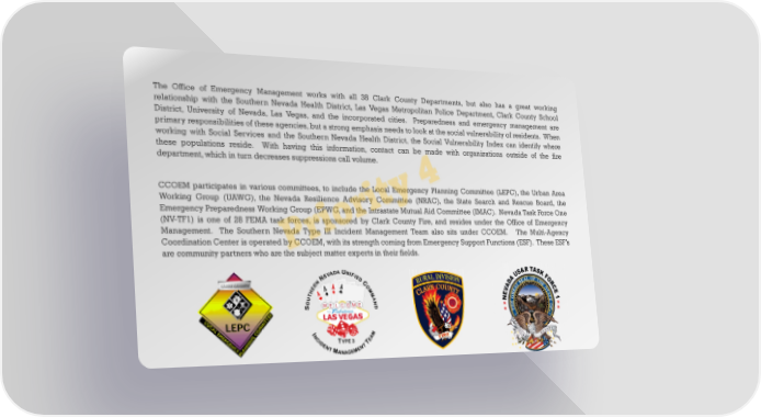 The Office of Emergency Management works with all 38 Clark County Departments, but also has a great working relationship with the Southern Nevada Health District, Las Vegas Metropolitan Police Department, Clark County School District, University of Nevada, Las Vegas, and the incorporated cities. Preparedness and emergency management are primary responsibilities of these agencies, but a strong emphasis needs to look at the social vulnerability of residents. When working with Social Services and the Southern Nevada Health District, the Social Vulnerability Index can identify where these populations reside. With having this information, contact can be made with organizations outside of the fire department, which in turn decreases suppressions call volume. CCOEM participates in various committees, to include the Local Emergency Planning Committee (LEPC), the Urban Area Working Group (UAWG), the Nevada Resilience Advisory Committee (NRAC), the State Search and Rescue Board, the Emergency Preparedness Working Group (EPWG, and the Intrastate Mutual Aid Committee (IMAC). Nevada Task Force One (NV-TF1) is one of 28 FEMA task forces, is sponsored by Clark County Fire, and resides under the Office of Emergency Management. The Southern Nevada Type III Incident Management Team also sits under CCOEM. The Multi-Agency Coordination Center is operated by CCOEM, with its strength coming from Emergency Support Functions (ESF). These ESF’s are community partners who are the subject matter experts in their fields.