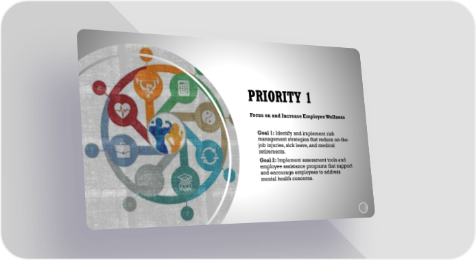 PRIORITY 1 Focus on and Increase Employee Wellness Goal 1: Identify and implement risk management strategies that reduce on-the- job injuries, sick leave, and medical retirements. Goal 2: Implement assessment tools and employee assistance programs that support and encourage employees to address mental health concerns.