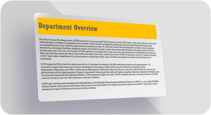 Department Overview The Clark County Fire Department (CCFD) serves all unincorporated Clark County, at nearly 8,000 square miles, about the size of the state of New Jersey, on behalf of a population of 2.4 million. Clark County’s jurisdiction includes the internationally famous Las Vegas Strip, encompassing most of the world’s largest hotels, housing more than 151,000 hotel rooms. The Las Vegas Strip includes arenas, stadiums, showrooms, convention facilities, shopping venues, and dozens of major indoor and outdoor special events, attracting nearly 40 million tourists each year. The men and women of CCFD perform remarkably every day, under the most stressful and challenging circumstances. Each day, they face personal risk to their health and safety, and major events such as the COVID-19 pandemic and the 1 October shooting of 2017 have taken a significant toll on being able to adequately retain, train, motivate, and sustain the health and well-being of our employees. CCFD supports 32 full-time fire stations as well as 10 volunteer fire stations. The 936 authorized positions and approximately 104 volunteers, support services such as Arson Investigations, Emergency Medical Services, Fire Prevention/Inspections, Fire Suppression/Operations, the Office of Emergency Management & Homeland Security, Airport Operations, Special Events, and internal services such as Fire Administration/Finance, Information Technology, Recruitment, Training, Logistics, Employee Assistance/Wellness, and Community Outreach/Public Relations/Media. CCFD personnel respond to over 150,000 incidents per year, including more than 120,000 medical incidents, and over 800 hazardous materials incidents. CCFD also oversees grant funding and administration of the Nevada Urban Search and Rescue Task Force (NVTF-1), one of only 28 FEMA- funded federal urban search and rescue task forces in the United States. The highly trained and experienced NVTF-1 responds to major disasters throughout Nevada and across the United States.