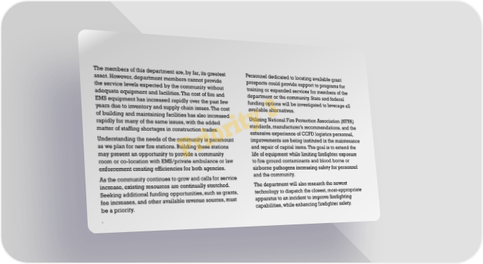 The members of this department are, by far, its greatest Personnel dedicated to locating available grant asset. However, department members cannot provide prospects could provide support to programs for the service levels expected by the community without training or expanded services for members of the adequate equipment and facilities. The cost of fire and department or the community. State and federal EMS equipment has increased rapidly over the past few funding options will be investigated to leverage all years due to inventory and supply chain issues. The cost available alternatives. of building and maintaining facilities has also increased Utilizing National Fire Protection Association (NFPA) rapidly for many of the same issues, with the added matter of staffing shortages in construction trades. standards, manufacturer’s recommendations, and the extensive experience of CCFD logistics personnel, Understanding the needs of the community is paramount improvements are being instituted in the maintenance as we plan for new fire stations. Building these stations and repair of capital items. The goal is to extend the may present an opportunity to provide a community life of equipment while limiting firefighter exposure room or co-location with EMS/private ambulance or law to fire ground contaminants and blood borne or enforcement creating efficiencies for both agencies. airborne pathogens increasing safety for personnel As the community continues to grow and calls for service and the community. increase, existing resources are continually stretched. The department will also research the newest Seeking additional funding opportunities, such as grants, technology to dispatch the closest, most-appropriate fee increases, and other available revenue sources, must apparatus to an incident to improve firefighting be a priority. capabilities, while enhancing firefighter safety. .