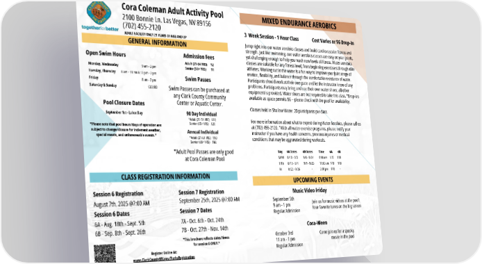 GENERAL INFORMATION CLASS REGISTRATION INFORMATION MIXED ENDURANCE AEROBICS UPCOMING EVENTS Day 6A Dates 6B Dates Time 6A 6B M/W 8/18 - 9/3 9/8 - 9/24 8:00 am $15 $18 T/Th 8/19 - 9/4 9/9 - 9/25 11:00 am $18 $18 Fri 8/22 - 9/26 - 2:00 pm $18 - Session 6 Registration August 7th, 2025 @7:00 AM 6A - Aug. 18th - Sept. 5th 6B - Sep. 8th - Sept. 26th Session 6 Dates *This brochure reflects dates/times for session 6 ONLY.* Jump right into our water aerobics classes and build cardiovascular fitness and strength. Just like swimming, our water aerobics classes are easy on your joints, yet challenging enough to help you reach new levels of fitness. Water aerobics classes are suitable for any fitness level, from beginning exercisers through elite athletes. Working out in the water is a fun way to improve your joint range of motion, flexibility, and balance through the comfortable resistance of water. Participants should work at their own pace and let the instructor know of any problems. Participants may bring and use their own water shoes; all other equipment is provided. Water shoes are not required to take this class. *Drop-ins available as space permits $6 – please check with the pool for availability. Classes held in Shallow Water. 20 participants per class. For more information about what to expect during Water Aerobics, please call us at (702) 455-2120. *With all water exercise programs, please notify your instructor if you have any health concerns, previous injuries or medical conditions that may be aggravated during workouts. Register Online At: www.ClarkCountyNV.gov/ParksRegistration 2100 Bonnie Ln. Las Vegas, NV 89156 (702) 455-2120 Cora Coleman Adult Activity Pool Pool Closure Dates Open Swim Hours Monday, Wednesday 9 am - 2 pm Tuesday, Thursday 8 am - 11 am & 12 pm - 2 pm Friday 8 am - 2 pm Saturday & Sunday CLOSED *Please note that pool hours/days of operation are subject to change/closure for inclement weather, special events, and unforeseeable events.* September 1st - Labor Day Swim Passes Swim Passes can be purchased at any Clark County Community Center or Aquatic Center. Admission Fees *Adult Pool Passes are only good at Cora Coleman Pool Session 7 Registration September 25th, 2025 @7:00 AM Session 7 Dates Cost Varies or $6 Drop-In 3 Week Session - 1 Hour Class Adult (21-54 YRS) $2 Senior (55+ YRS) $1 90 Day Individual *Adult (21-54 YRS) $30 Senior (55+ YRS) $20 Annual Individual *Adult (21-54 YRS) $90 Senior (55+ YRS) $60 ADULT FACILITY ONLY 21 YEARS OF AGE AND UP 7A - Oct. 6th - Oct. 24th 7B - Oct. 27th - Nov. 14th Music Video Friday September 5th 9 am - 1 pm Regular Admission Join us for music videos at the pool! Your favorite tunes on the big screen October 3rd 11 am - 1 pm Regular Admission Come join us for a spooky movie in the pool Cora-Ween