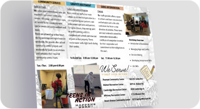 COMMUNITY SERVICE GRAFFITI ABATEMENT Back On Track We serve court ordered teens who are required to volunteer community service. Volunteer opportunities such as: service to the community with special events set-up/breakdown and more. Teens are allowed up to four hours during weekdays and eight hours on weekends. We provide after-school community service projects and weekends for youth to accumulate and complete their required community service hours. Tue.-Thur. 2:00 pm-6:00 pm Code Enforcement Program Teens meet our staff at our main campus to receive transportation to a site organized by our partners code enforcement specialist and painters. For up to 4 hours, they overlay paint on graffiti painting until it is completed with a fresh and new coat of paint on that property. Teens receive water and a light lunch during their service. 1st & 2nd Sat. 8:00 am-12:00 pm GANG INTERVENTION Our staff specialist offers a space to unlearn and learn new mindsets and behaviors with a life skills curriculum that foster a new direction of activities. These teens are court-ordered to attend five consecutive classes with a certificate of completion incentive for their cooperation and commitment to their obligations to the court. Sat. 11:00 am-12:30 pm Workshop Overview Introduction to Expectations Managing Anger and Conflict Decision Making Developing Interpersonal Skills Life Skills Classes TEENS IN TEENS IN TEENS IN ACTION ACTION ACTION H A P P E N S H E R E ! ! Visit Our Sites: Pearson Community Center 1625 W. Carey Ave. Walnut Recreation Center 3075 N. Walnut Rd. Cambridge Recreation Center 3930 Cambridge St. Whitney Recreation Center 5712 Missouri Ave Desert Breeze Community Center 8275 Spring Mountain Rd