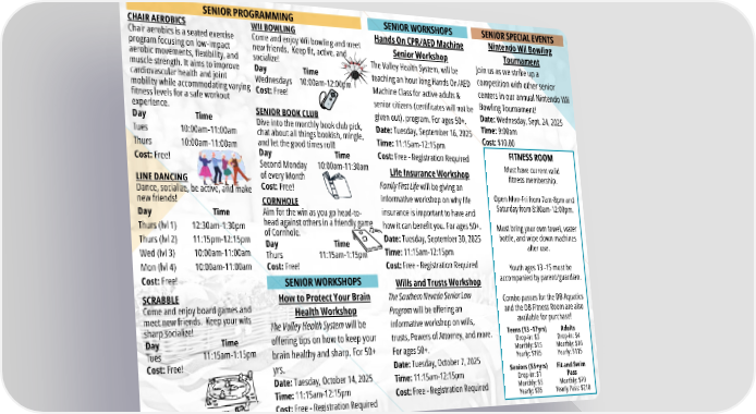 SENIOR WORKSHOPS Hands On CPR/AED Machine Senior Workshop The Valley Health System, will be teaching an hour long Hands On/AED Machine Class for active adults & senior citizens (certificates will not be given out). program. For ages 50+. Date: Tuesday, September 16, 2025 Time: 11:15am-12:15pm Cost: Free - Registration Required FITNESS ROOM Must have current valid fitness membership. Open Mon-Fri from 7am-8pm and Saturday from 8:00am-12:00pm. Must bring your own towel, water bottle, and wipe down machines after use. Youth ages 13 -15 must be accompanied by parent/guardian. Combo passes for the DB Aquatics and the DB Fitness Room are also available for purchase! Teens (13 -17yrs) Drop-in: $3 Monthly: $15 Yearly: $105 Adults Drop-in: $4 Monthly: $16 Yearly: $115 Seniors (55+yrs) Drop-in: $1 Monthly: $5 Yearly: $35 Fit and Swim Pass Monthly: $70 Yearly Pass: $210 SENIOR SPECIAL EVENTS Chair aerobics is a seated exercise program focusing on low-impact aerobic movements, flexibility, and muscle strength. It aims to improve cardiovascular health and joint mobility while accommodating varying fitness levels for a safe workout experience. SENIOR PROGRAMMING CHAIR AEROBICS LINE DANCING Dance, socialize, be active, and make new friends! Day Time Thurs (lvl 1) 12:30am-1:30pm Thurs (lvl 2) 11:15pm-12:15pm Wed (lvl 3) 10:00am-11:00am Mon (lvl 4) 10:00am-11:00am Cost: Free! WII BOWLING Come and enjoy Wii bowling and meet new friends. Keep fit, active, and socialize! Day Time Wednesdays 10:00am-12:00pm Cost: Free! SCRABBLE Come and enjoy board games and meet new friends. Keep your wits sharp socialize! Day Time Tues 11:15am-1:15pm Cost: Free! SENIOR BOOK CLUB Dive into the monthly book club pick, chat about all things bookish, mingle, and let the good times roll! Day Time Second Monday 10:00am-11:30am of every Month Cost: Free! CORNHOLE Aim for the win as you go head-to- head against others in a friendly game of Cornhole. Day Time Thurs 11:15am-1:15pm Cost: Free! Day Time Tues 10:00am-11:00am Thurs 10:00am-11:00am Cost: Free! Life Insurance Workshop Family First Life will be giving an informative workshop on why life insurance is important to have and how it can benefit you. For ages 50+. Date: Tuesday, September 30, 2025 Time: 11:15am-12:15pm Cost: Free - Registration Required Wills and Trusts Workshop The Southern Nevada Senior Law Program will be offering an informative workshop on wills, trusts, Powers of Attorney, and more. For ages 50+. Date: Tuesday, October 7, 2025 Time: 11:15am-12:15pm Cost: Free - Registration Required SENIOR WORKSHOPS How to Protect Your Brain Health Workshop The Valley Health System will be offering tips on how to keep your brain healthy and sharp. For 50+ yrs. Date: Tuesday, October 14, 2025 Time: 11:15am-12:15pm Cost: Free - Registration Required Nintendo Wii Bowling Tournament Join us as we strike up a competition with other senior centers in our annual Nintendo Wii Bowling Tournament! Date: Wednesday, Sept. 24, 2025 Time: 9:00am Cost: $10.00