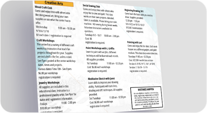 Paint Workshops with L. Griffin Learn to paint with acrylics. Different techniques will be learned each month. All supplies provided. 1st Tuesdays 11:00 am - 12:30 pm Cost: $6.00 each workshops registration is required. Meditative Sketch with Janet Learn skills to improve your drawing ability. Participants will learn lines, shading and diff. techniques. All supplies provided. 3rd Tuesdays 11:00 am - 12:30 pm Cost: $6.00 each workshops registration is required Wood Craft Club Come and enjoy time with others who like doing wood art. Bring your own supplies or use what the center has to offer. Wednesday: 9:00 am - 10:30 pm 9/10 & 12/10 $1 each date / registration is required Craft Workshops The center has a variety of different craft workshop instructors that teach fun projects throughout the year. Supplies are included in the fee, unless noted. See flyers posted at the center workshop dates, times and projects. Various dates/Time TBA - See Flyers $6.00 per workshop registration is required Jewelry Workshops All supplies are included in this educational class. Instructor is a professional jewelry artist. See flyer for dates and registration information. Fridays 11:00 - 2:00 pm $10.00 per workshop registration is required Creative Arts Social Sewing Club Come and enjoy time with others who enjoy like to sew and quilt. This class works on their own projects. donated fabric is available. Please bring your own machine. NO sewing during break weeks. Volunteer instructors available for questions. Tuesdays 9/2 - 10/7 10:00 am - 2:00 pm Cost: $6 registration is required. Beginning Drawing 101 Come learn the basic skills you need to draw. Supplies provided. 12:30 pm - 1:30 pm 9/8 -9/22 or 10/13-10/27 $15.00 3 week session registration is required. Painting with Lori Come and enjoy this fun class. Each week focuses on a different project, and paint medium. This class does watercolors too. Tuesdays 11:00 am - 12:30 pm Cost: $22.00 4-week class session Session 6: 9/10, 9/17, 10/1, & 10/8 Session 7: 10/29 - 11/19 registration is required. Occasionally there may be an error in days, times, registration requirements, or fees in this brochure. When errors do occur, our staff will do everything possible to correct the situation promptly. Thank you for your patience and understanding should these situations arise. MISTAKES HAPPEN