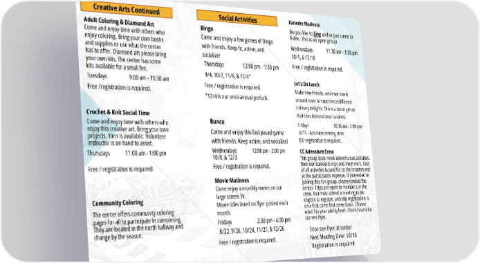 Creative Arts Continued Adult Coloring & Diamond Art Come and enjoy time with others who enjoy coloring. Bring your own books and supplies or use what the center has to offer. Diamond art please bring your own kits. The center has some kits available for a small fee. Tuesdays 9:00 am - 10:30 am Free /registration is required. Crochet & Knit Social Time Come and enjoy time with others who enjoy this creative art. Bring your own projects. Yarn is available. Volunteer instructor is on hand to assist. Thursdays 11:00 am - 1:00 pm Free / registration is required. Community Coloring The center offers community coloring pages for all to participate in completing. They are located in the north hallway and change by the season. Social Activities Bingo Come and enjoy a few games of Bingo with friends. Keep fit, active, and socialize! Thursdays 12:00 pm - 1:30 pm Bunco 12:00 pm - 2:00 pm Movie Matinees Come enjoy a monthly movie on our large screen TV. Movie titles listed on flyer posted each month. Fridays 8/22, 9/26, 10/24, 11/21, & 12/26 Free / registration is required. 2:30 pm - 4:30 pm Karaoke Madness 11:30 am - 1:30 pm Fridays 10:30 am - 2:00 pm 8/15 - Fall dates coming soon $3/ registration is required. Let’s Do Lunch Make new friends, while we travel around town to experience different culinary delights. This is a social group that tries international cuisines. CC Adventure Crew This group does more adventurous activities then our standard trips and meet me’s. Cost of all activities is paid for to the location and at the participants expense. If interested in joining this fun group, please contact the center. Trips are open to members in the crew. You must attend a meeting to be eligible to register, and trip registration is on a first come first serve basis. Choose what fits your ability level. Check board for current flyer. Trips see flyer at center Next Meeting Date: 10/10 Registration is required Do you like to Sing and or just come to listen. This is an open group. Come and enjoy this fast paced game with friends. Keep active, and socialize! Wednesdays 10/8, & 12/3 Free / registration is required. Wednesdays 10/1, & 12/10 Free / registration is required. 9/4, 10/2, 11/6, & 12/4* Free / registration is required. *12/4 is our semi-annual potluck.