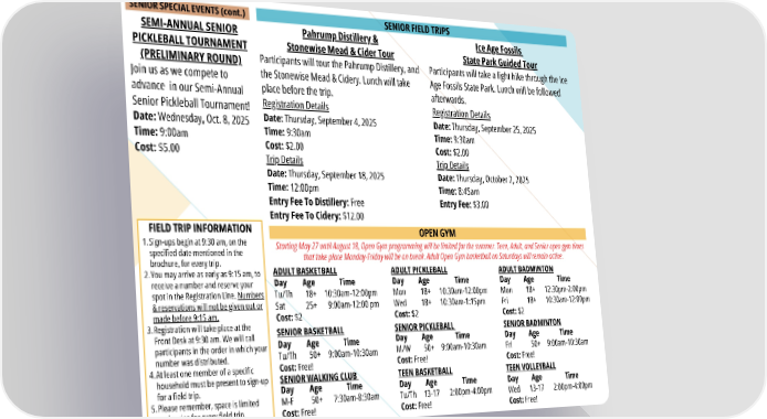 FIELD TRIP INFORMATION 1.Sign-ups begin at 9:30 am, on the specified date mentioned in the brochure, for every trip. 2.You may arrive as early as 9:15 am, to receive a number and reserve your spot in the Registration Line. Numbers & reservations will not be given out or made before 9:15 am. 3.Registration will take place at the Front Desk at 9:30 am. We will call participants in the order in which your number was distributed. 4.At least one member of a specific household must be present to sign-up for a field trip. 5.Please remember, space is limited and varies for every field trip. OPEN GYM SENIOR FIELD TRIPS ADULT BASKETBALL Day Age Time Tu/Th 18+ 10:30am-12:00pm Sat 25+ 9:00am-12:00 pm Cost: $2 TEEN BASKETBALL Day Age Time Tu/Th 13-17 2:00pm-4:00pm Cost: Free! TEEN VOLLEYBALL Day Age Time Wed 13-17 2:00pm-4:00pm Cost: Free! SENIOR BASKETBALL Day Age Time Tu/Th 50+ 9:00am-10:30am Cost: Free! ADULT PICKLEBALL Day Age Time Mon 18+ 10:30am-12:00pm Wed 18+ 10:30am-1:15pm Cost: $2 SENIOR PICKLEBALL Day Age Time M/W 50+ 9:00am-10:30am Cost: Free! ADULT BADMINTON Day Age Time Mon 18+ 12:30pm-2:00pm Fri 18+ 10:30am-12:00pm Cost: $2 SENIOR BADMINTON Day Age Time Fri 50+ 9:00am-10:30am Cost: Free! Starting May 27 until August 18, Open Gym programming will be limited for the summer. Teen, Adult, and Senior open gym times that take place Monday-Friday will be on break. Adult Open Gym basketball on Saturdays will remain active. SENIOR WALKING CLUB Day Age Time M-F 50+ 7:30am-8:30am Cost: Free! SENIOR SPECIAL EVENTS (cont.) SEMI-ANNUAL SENIOR PICKLEBALL TOURNAMENT (PRELIMINARY ROUND) Join us as we compete to advance in our Semi-Annual Senior Pickleball Tournament! Date: Wednesday, Oct. 8, 2025 Time: 9:00am Cost: $5.00 Pahrump Distillery & Stonewise Mead & Cider Tour Participants will tour the Pahrump Distillery, and the Stonewise Mead & Cidery. Lunch will take place before the trip. Registration Details Date: Thursday, September 4, 2025 Time: 9:30am Cost: $2.00 Trip Details Date: Thursday, September 18, 2025 Time: 12:00pm Entry Fee To Distillery: Free Entry Fee To Cidery: $12.00 Ice Age Fossils State Park Guided Tour Participants will take a light hike through the Ice Age Fossils State Park. Lunch will be followed afterwards. Registration Details Date: Thursday, September 25, 2025 Time: 9:30am Cost: $2.00 Trip Details Date: Thursday, October 2, 2025 Time: 8:45am Entry Fee: $3.00