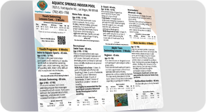 Youth Swimming Lessons Cont. - 3 Weeks 7025 S. Fort Apache Rd., Las Vegas, NV 89148 (702) 455-1708 AQUATIC SPRINGS INDOOR POOL Scan or click QR code to view Entrance Skills Youth Programs - 6 Weeks Intro to Aquatic Sports - 45 min. Age: 6 YRS - 17 YRS This class is designed to introduce participants to the mechanics of aquatics sports such as competitive swimming, water polo, artistic swimming, and junior lifeguarding skills. Water safety skills are also incorporated into the lessons. Intro to AQ Sports This class will not be offered during Session 6. Artistic Swimming - 60 min. Age: 6 YRS - 17 YRS This is a recreational level artistic swimming program that encourages teamwork and self-esteem. Participants will learn the fundamentals of artistic swimming, which blends creative movement and dance in the water. Artistic Swimming Day Dates Time Price T/TH 08/18 - 09/24 4:00 PM $60 Water Polo - 60 min. Age: 6 YRS - 17 YRS This recreational water polo course covers teamwork, fitness, critical thinking, decision making, agility and endurance. Participants will learn proper swimming techniques, how to tread water efficiently using the eggbeater technique, handle, pass and shoot a ball, along with goal keeping. Water Polo This class will not be offered during Session 6. Recreational Swim Team - 60 min. Age: 6 YRS - 17 YRS This is a recreational level swim team program that encourages teamwork and self-esteem. Participants will practice developing strokes and improve personal times and skills. Emphasis is on personal improvement. Skills Required to Enter: 1) Swim 25 yards of freestyle with effective side breathing 2) Swim 25 yards of backstroke 3) Swim 25 yards of elementary backstroke 4) Swim 25 yards of breaststroke. 5) Swim 5 strokes of butterfly 6) Complete 1 minute of treading. It is highly recommended that the participant complete Advanced Stroke Development before enrolling. Swim Team Day Dates Time Price T/TH 08/19 - 09/04 6:00 PM $60 SAT 08/23 - 09/27 10:30 AM $30 Jr. Guard - 60 min. Age: 10 YRS - 15 YRS Interested in being a lifeguard but aren’t sure if its for you? Junior Lifeguard is here to help! Class Goals: To recognize and understand emergency responses in and out of the water, learn and apply basic life support, learn and apply basic first aid, and work on professional development. Skills Required to Enter: 1) Swim 25 yards while using the rescue tube 2) Swim 25 yards without using the rescue tube 3) Tread water for 30 seconds Jr. Guard This class will not be offered during Session 6. Adult/ Teen Swimming Lessons - 3 Weeks Beginner - 45 min. Age: 13+ YRS These swim lessons are designed to meet each participant’s personal goals within a group setting. Instructors work with each participant to overcome apprehension and learn basic swimming skills such as floating, submersion, and basic stroke development. This class mostly takes place in shallow water, however it may move to deep water depending on participants’ readiness. Intermediate/ Advanced - 45 min. These swim lessons are designed to meet each participant’s personal goals within a group setting. Instructors work with each participant to refine skills such as treading, diving, and stroke development. This class usually takes place in the lap pool, however it may move to shallow water if needed. Water Aerobics - 6 Weeks Jump into our water aerobics classes and build cardiovascular fitness and strength. Our water aerobics classes are easy on your joints, yet challenging enough to help you reach new levels of fitness. Our water aerobics classes are suitable for any fitness level, from beginning exercisers through elite athletes. Working out in the water is a fun way to improve your joint range of motion, flexibility and balance through the comfortable resistance of water. Participants should work at their own pace and let the instructor know of any problems. Age: 13+ YRS Shallow Water Aerobics - 60 min. This class takes place in the shallow water (3-5 ft.). Shallow Water Aerobics Day Dates Time Price FRI 08/22 - 09/26 8:15 AM $18 SAT 08/23 - 09/27 8:00 AM $18 Advanced Stroke Development Day 6A Dates 6B Dates Time 6A 6B M/W 08/18 - 09/03 09/08 - 09/24 5:00 PM $25 $30 SAT 08/23 - 09/27 - 8:15 AM $30 - *There are no classes on Monday, September 1 * st Beginning Adult Day 6A Dates 6B Dates Time 6A 6B T/TH 08/19 - 09/04 09/09 - 09/25 6:15 PM $30 $30 SAT 08/23 - 09/27 - 10:15 AM $30 - Intermediate/ Advanced Adult Day 6A Dates 6B Dates Time 6A 6B T/TH 08/19 - 09/04 09/09 - 09/25 5:15 PM $30 $30