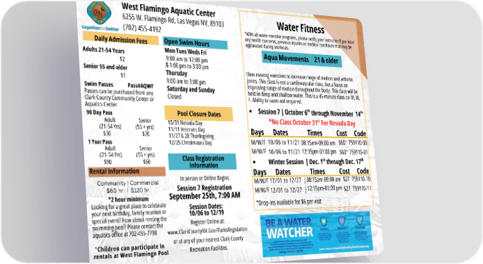 Rental Information *2 hour minimum Looking for a great place to celebrate your next birthday, family reunion or special event? How about renting the swimming pool? Please contact the aquatics office at 702-455-7798 *Children can participate in rentals at West Flamingo Pool Daily Admission Fees Class Registration Information Pool Closure Dates Open Swim Hours Mon Tues Weds Fri 9:00 am to 12:00 pm & 1:00 pm to 3:00 pm Thursday 9:00 am to 3:00 pm Saturday and Sunday Closed 6255 W. Flamingo Rd, Las Vegas NV, 89103 (702) 455-4192 West Flamingo Aquatic Center Adults 21-54 Years $2 Senior 55 and older $1 Swim Passes Pass#AQWF Passes can be purchased from any Clark County Community Center or Aquatics Center 90 Day Pass Adult Senior (21-54 Yrs) (55 + yrs) $30 $20 1 Year Pass Adult Senior (21-54 Yrs) (55 + yrs) $90 $60 10/31 Nevada Day 11/11 Veterans Day 11/27 & 28 Thanksgiving 12/25 Christmases Day In person or Online Begins Session 7 Registration September 25th, 7:00 AM Session Dates: 10/06 to 12/19 Register Online at: www.ClarkCountyNV.Gov/ParksRegistation or at any of your nearest Clark County Recreation Facilities. *With all water exercise programs, please notify your instructor if you have any health concerns, previous injuries or medical conditions that may be aggravated during workouts Water Fitness Aqua Movements 21 & older Slow moving exercises to increase range of motion and arthritic joints. This class is not a cardiovascular class, but a focus on improving range of motion throughout the body. This class will be held in deep and shallow water. This is a 45-minute class on M, W, F. Ability to swim not required. Session 7 | October 6 through November 14 *No Class October 31 For Nevada Day th th st M/W/F M/W/F Dates Times Cost 10/06 to 11/21 10/06 to 11/21 08:15am-09:00 am 12:15pm-01:00 pm 759110-01 759110-00 $60* $60* Code Days *Drop-ins available for $6 per visit Community | Commercial $60 hr | $120 hr Winter Session | Dec. 1 through Dec. 17 st th M/W/F M/W/F 12/01 to 12/27 | 12/01 to 12/27 | 08:15am-09:00 am 12:15pm-01:00 pm 759110-11 759110-10 $27 $27 Dates Times Cost Code Days