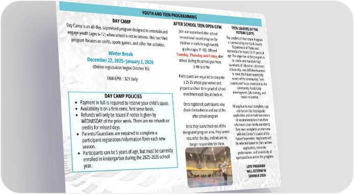 Day Camp is an all-day, supervised program designed to entertain and engage youth (ages 6-12) when school is not in session. This fun filled program focuses on crafts, sports games, and other fun activities. Winter Break December 22, 2025- January 2, 2026 (Online registration begins October 16) 7AM-6PM | $21 daily Payment in full is required to reserve your child’s space. Availability is on a first come, first serve basis. Refunds will only be issued if notice is given by WEDNESDAY of the prior week. There are no refunds or credits for missed days. Parents/Guardians are required to complete a participant registration/information form each new season. Participants can be 5 years of age, but must be currently enrolled in kindergarten during the 2025-2026 school year. DAY CAMP POLICIES AFTER SCHOOL TEEN OPEN GYM DAY CAMP Join our supervised after-school recreational-based program for children in sixth through twelfth grades (ages 11-18). Offered Tuesday, Thursday and Friday after school during the school year from 3 PM to 6 PM Participants are required to complete a 25-26 school year waiver and present a school ID or proof of school enrollment each day at check-in. Once registered, participants may check themselves in and out of the after school program Once they leave/check out of the designated program area, they cannot return for the day, and we are no longer responsible for them. YOUTH AND TEEN PROGRAMMING TEEN LEADERS OF THE FUTURE (LOTF) The Leaders of the Future Program is sponsored by the Clark County Department of Parks and Recreation for teens 13-17 years of age. The objective of the program is to create and maintain high standards of education, character, citizenship, and skill development to meet the future leadership needs of the community. Teen Leaders will focus on service to the community, leadership development, job training, and social recreation. All applicants must complete, sign and turn in the Teen Leader application and include two letters of recommendation from their references (non-family members). They must complete an interview with the Center’s Leader of the Future Supervisor. Applicants will be selected based on their written application, interview performance, and availability of open positions within the program. LOTF PROGRAM WILL RETURN IN SUMMER 2026