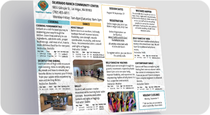 COOKING DANCE SECRETLY FINE DINING BALLET Students will explore creative movement while learning basic ballet concepts. Recommended attire: Leotard and tights or leggings. Instructor: Sistine Day Date Time Age Cost Activity Code S 8/23-9/27 10:15-11am 3-4 $27 Ballet 01 S 8/23-9/27 11:15-12pm 5-6 $27 Ballet 02 Embark on a skill-focused journey to mastering your way through the kitchen. Learn how and why to use ingredients, safe knife skills, proper food storage, and most of all, how to make delicious food fun for everyone. Instructor: Danielle Day Date Time Age Cost Activity Code T 8/19-9/23 5-7pm 21+ $46 Cooking 01 T 8/19-9/23 11am-1pm 50+ $46 Cooking 02 Learn secrets of High-end restaurant style cooking, tricks to simplify every day meals and how to elevate your favorite dishes to impress your friends. Train your palate while experiencing new and exciting dishes. Instructor: Danielle REGISTRATION Online Registration can be found at: www.ClarkCountyNV.Gov/ ParksRegistration 9855 Gilespie St, Las Vegas, NV 89183 (702) 455-6811 Monday-Friday: 7am-8pm|Saturday: 8am-3pm SILVERADO RANCH COMMUNITY CENTER COOKING FUNDAMENTALS BELLY DANCE W/ HEIDI Come and learn traditional belly dance moves in this mixed level class. We will learn fun traditional belly dance moves. Instructor: Heidi Day Date Time Age Cost Activity Code M 8/18-9/22 5-6pm 13+ $27 Belly Dance Mon 01 BELLY DANCE W/ HEATHER Unlock your core strength through the graceful movements inspired by Arabic dance! Join us to tone your body, improve flexibility, and experience the empowering rhythm of belly dance in a fun, supportive environment. Instructor: Heather Day Date Time Age Cost Activity Code F 8/22-9/26 7-8pm 13+ $35 Belly Dance Fri 01 Online begins July 24 @ 7am Walk in begins July 28 @ 7am MISTAKES HAPPEN Occasionally there may be an error in days, times, registration requirements, or fees in this brochure. When errors do occur, our staff will do everything possible to correct the situation promptly. Thank you for your patience and understanding should these situations arise. All activity codes start with 6 Silverado Ranch SESSION DATES August 18-September 27 ADULT BALLET Ballet class is an excellent, full-body workout that will improve balance, flexibility, core strength, muscle coordination, musicality, and mental focus. Recommended attire: Leotard and tights or leggings. Instructor: Sistine Day Date Time Age Cost Activity Code Th 8/21-9/25 6-7pm 16+ $35 Adult Ballet 01 (Basics) Th 8/21-9/25 7-8pm 16+ $35 Adult Ballet 02 (Interm) HOLIDAY CLOSURES ** All class fees are prorated to reflect any facility closure dates Day Date Time Age Cost Activity Code Th 8/21-9/25 5-8pm 18+ $62 Fine Dining 01 Monday, September 1 CONTEMPORARY DANCE Dancers will focus on exploring and finding their voice as a dancer within the context of contemporary dance. Come as you are! Open to everyone from complete beginners to advanced dancers. Instructor: Sistine Day Date Time Age Cost Activity Code M 8/18-9/22 7-8pm 12+ $30 Contemporary 01 To register online, you can click on the activity code.