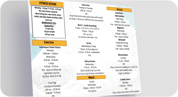 Low Impact Senior Fitness Mondays 10:00 am – 11:00 am Wednesdays 9:30 am - 10:30 am Fridays 9:30 am - 10:30 am Free - Space is limited and registration required. No Class: 10/31, & 11/28 Chair Yoga Tuesdays & Thursdays 9:45 am – 10:30 am 10:45 am - 11:30 am $40 FITNESS ROOM Monday - Friday: 7:15 am - 4:45 pm No reservation required. Must bring your own towel, water bottle and wipe down machines after each use. MEMBERSHIP FEES: Seniors(55+) $1 per day $5 per month $35 per year Exercise Dancercise Tuesdays & Thursdays 8:00 am - 8:45 am $40 Drop in fees for the above paid classes will be $6.00 per drop in. Please see staff if you have any questions Beat It - Cardio Drumming Fridays - 9/19, 10/17, 11/21, & 12/19 2:00 pm - 3:00 pm $6 / per class Fun seated cardio driven class. Tai Chi Wednesdays & Fridays 7:30 am - 8:30 am Beginners 8:30 am - 9:30 am - Intermediate Free African Drums Wednesdays - 9:30 am - 10:15 am $$25 or $6.00 drop in per class Learn how to play the drums with William T. Line Dance Intermediate Wednesday 1:00 pm - 2:00 pm Free - upon instructor approval Beginners Wednesday 2:00 pm - 3:00 pm Free - Space is limited Advanced Tuesday & Thursday 12:00 pm - 1:00 pm Free - Space is limited African Dance Tuesdays 1:15 pm - 2:00 pm $26 Class can be done standing or in a chair for those with mobility issues. Taught by William T. Cumbia Dance Mondays 11:00 am - 11:45 am $26 Class can be done alone or with a partner. Dance Music Ukulele Wednesdays 2:00 pm - 3:00 pm / $26.00 No Drop ins
