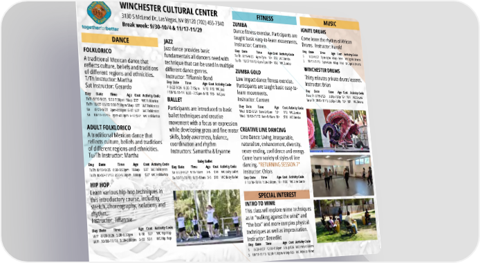 DANCE FITNESS SPECIAL INTEREST MUSIC Baby Ballet Day Date Time Age Cost Activity Code Sa 8/23-9/27 9:15-10am 3-5 $18 WC Baby Ballet Sa 10/11-11/15 9:15-10am 3-5 $18 WC Baby Ballet 3130 S McLeod Dr, Las Vegas, NV 89120 (702) 455-7340 Break week: 9/30-10/4 & 11/17-11/29 WINCHESTER CULTURAL CENTER FOLKLORICO A traditional Mexican dance that reflects culture, beliefs and traditions of different regions and ethnicities. T/Th Instructor: Martha Sat Instructor: Gerardo Day Date Time Age Cost Activity Code TuTh 8/19-9/25 5:30-7:30pm 5&up $37 WC Folklorico TuTh 10/07-11/13 5:30-7:30pm 5&up $37 WC Folklorico Sa 8/23-9/27 2pm-4:00pm 6-17 $37 WC Folklorico Sa 10/11-11/15 2pm-4:00pm 6-17 $37 WC Folklorico JAZZ Jazz dance provides basic fundamentals all dancers need with technique that can be used in multiple different dance genres. Instructor: Tiffannie Bond Day Date Time Age Cost Activity Code F 8/22-9/26 6 :30- 7:15pm 6-18 $18 WC Jazz F 10/10-11/14 6:30 - 7:15pm 6-18 $15 WC Jazz BALLET ZUMBA Dance fitness exercise. Participants are taught basic easy-to-learn movements. Instructor: Carmen Day Date Time Age Cost Activity Code Tu-Th 8/19-9/25 6pm-7pm 18+ $53 WC Zumba Tu-Th 10/07-11/13 6pm-7pm 18+ $53 WC Zumba CREATIVE LINE DANCING Line Dance: Living, inseparable, naturalism, enhancement, diversity, never-ending, confidence and energy. Come learn variety of styles of line dancing. *RETURNING SESSION 7* Instructor: Chlois Day Date Time Age Cost Activity Code F 10/10-11/14 1:30-3:30pm 18+ FREE WC Line Dance HIP HOP Learn various hip-hop techniques in this introductory course, including stretch, choreography, isolations and rhythm. Instructor: Tiffannie Day Date Time Age Cost Activity Code W/F 8/20-9/26 5:30-6:30pm 6-18 $37 WC Hip Hop W/F 10/08-11/14 5:30-6:00pm 6-18 $34 WC Hip Hop ADULT FOLKLORICO A traditional Mexican dance that reflects culture, beliefs and traditions of different regions and ethnicities. Tu/Th Instructor: Martha Day Date Time Age Cost Activity Code TuTh 8/19-9/25 4:30-5:30pm 18&up $37 WC Folklorico TuTh 10/07-11/13 4:30-5:30pm 18&up $37 WC Folklorico Participants are introduced to basic ballet techniques and creative movement with a focus on expression while developing gross and fine motor skills, body awareness, balance, coordination and rhythm Instructors: Samantha & Eryanne ZUMBA GOLD Low impact dance fitness exercise. Participants are taught basic easy-to- learn movements. Instructor: Carmen Day Date Time Age Cost Activity Code Wed 8/20-9/24 9am-9:45am 18+ $18 WC Zumba Wed 10/08-11/12 9am-9:45am 18+ $18 WC Zumba WINCHESTER DRUMS Thirty minutes private drums lessons. Instructor: Brian Day Date Time Age Cost Activity Code Tu or Th 8/19-9/25 3:30p-7:30p 12+ $84 WC Drums Tu or Th 10/07-11/13 3:30p-7:30p 12+ $84 WC Drums INTRO TO MIME This class will explore mime techniques as in “walking against the wind” and “the box” and more complex physical techniques as well as improvisation. Instructor: Benedikt Day Date Time Age Cost Activity Code S 8/23-9/27 12:30-1:30pm 6 &up $26 WC Intro to Mime S 10/11-11/15 12:30-1:30pm 6 &up $26 WC Intro to Mime IGNITE DRUMS Come learn the rhythm of African Drums. Instructor: Harold Day Date Time Age Cost Activity Code S 8/23-9/27 5pm-6pm 6&up Free WC Ignite Drums S 10/11-11/15 5pm-6pm 6&up Free WC Ignite Drums