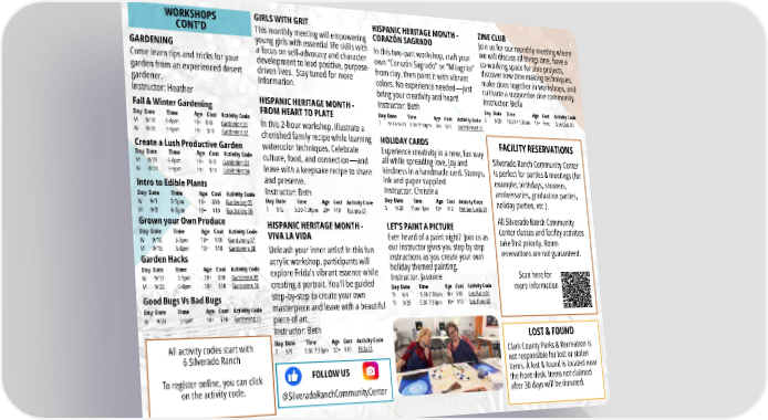 Silverado Ranch Community Center is perfect for parties & meetings (for example; birthdays, showers, anniversaries, graduation parties, holiday parties, etc.). All Silverado Ranch Community Center classes and facility activities take first priority. Room reservations are not guaranteed. Scan here for more information FACILITY RESERVATIONS FOLLOW US @SilveradoRanchCommunityCenter GARDENING Come learn tips and tricks for your garden from an experienced desert gardener. Instructor: Heather Fall & Winter Gardening Day Date Time Age Cost Activity Code M 8/18 6-8pm 18+ $10 Gardening 01 W 8/20 3-5pm 18+ $10 Gardening 02 Create a Lush Productive Garden Day Date Time Age Cost Activity Code M 8/25 6-8pm 18+ $10 Gardening 03 W 8/27 3-5pm 18+ $10 Gardening 04 Intro to Edible Plants Day Date Time Age Cost Activity Code W 9/3 3-5pm 18+ $10 Gardening 05 M 9/8 6-8pm 18+ $10 Gardening 06 Grown your Own Produce Day Date Time Age Cost Activity Code W 9/10 3-5pm 18+ $10 Gardening 07 M 9/15 6-8pm 18+ $10 Gardening 08 Garden Hacks Day Date Time Age Cost Activity Code W 9/17 3-5pm 18+ $10 Gardening 09 M 9/22 6-8pm 18+ $10 Gardening 10 Good Bugs Vs Bad Bugs Day Date Time Age Cost Activity Code W 9/24 3-5pm 18+ $10 Gardening 11 All activity codes start with 6 Silverado Ranch To register online, you can click on the activity code. WORKSHOPS CONT’D In this 2-hour workshop, illustrate a cherished family recipe while learning watercolor techniques. Celebrate culture, food, and connection—and leave with a keepsake recipe to share and preserve. Instructor: Beth HISPANIC HERITAGE MONTH - FROM HEART TO PLATE Day Date Time Age Cost Activity Code T 9/2 5:30-7:30pm 20+ $10 Recipes 01 Unleash your inner artist! In this fun acrylic workshop, participants will explore Frida's vibrant essence while creating a portrait. You'll be guided step-by-step to create your own masterpiece and leave with a beautiful piece of art. Instructor: Beth HISPANIC HERITAGE MONTH - VIVA LA VIDA Day Date Time Age Cost Activity Code T 9/9 5:30-7:30pm 20+ $10 Frida 01 GIRLS WITH GRIT This monthly meeting will empowering young girls with essential life skills with a focus on self-advocacy and character development to lead positive, purpose- driven lives. Stay tuned for more information. In this two-part workshop, craft your own “Corazón Sagrado” or “Milagrito” from clay, then paint it with vibrant colors. No experience needed—just bring your creativity and heart! Instructor: Beth HISPANIC HERITAGE MONTH - CORAZÓN SAGRADO Day Date Time Age Cost Activity Code T 9/16-9/23 5:30-7:30pm 20+ $20 Sacred Heart 01 HOLIDAY CARDS Experience creativity in a new, fun way all while spreading love, joy and kindness in a handmade card. Stamps, ink and paper supplied Instructor: Christina Day Date Time Age Cost Activity Code S 9/20 11am-1pm 18+ $10 Holiday Cards 01 LOST & FOUND Clark County Parks & Recreation is not responsible for lost or stolen items. A lost & found is located near the front desk. Items not claimed after 30 days will be donated. ZINE CLUB Join us for our monthly meeting where we will discuss all things zine, have a co-working space for zine projects, discover new zine making techniques, make zines together in workshops, and cultivate a supportive zine community. Instructor: Bella Day Date Time Age Cost Activity Code S 9/20 10:30-11:30am 10+ Free Zine Club 01 LET’S PAINT A PICTURE Ever heard of a paint night? Join us as our instructor gives you step by step instructions as you create your own holiday themed painting. Instructor: Jasmine Day Date Time Age Cost Activity Code Th 9/4 5:30-7:30pm 10+ $10 Lets Paint 01 Th 9/25 5:30-7:30pm 10+ $10 Lets Paint 02