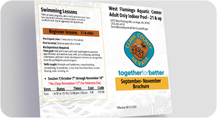 September- November Brochure West Flamingo Aquatic Center Adult Only Indoor Pool - 21 & up *Effective 09/13/2025 6255 West Flamingo Rd, Las Vegas, NV, 89103 (702) 455-4192 [email protected] Days Tues Dates Times Cost Code 10/07 to 11/18 | 12:00 pm-1:00 pm $30 759108 Participant ratio: 1 instructor to 10 students Pool location: Shallow water (0 to 5 feet) No Experience Required Class goal: Instructors work with each participant to overcome apprehension and work on basic skills such as floating, swimming underwater, and basic stroke development. Lessons are designed to meet the participants personal goals. Skills taught: Freestyle and backstroke, rotary breathing, streamlining, breaststroke, scissor kick, front/back float, survival floating, basic treading, etc. Swimming Lessons *With all water programs, please notify your instructor if you have any health concerns, previous injuries or medical conditions that may be aggravated during workouts Beginner lessons 21 & older Session 7|October 7 through November 18 th th *No Class November 11 For Veterans Day th