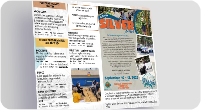 SENIOR PROGRAMMING FOR AGES 50+ PERFORMING ARTS CONT’D VOCAL CLASS Learn the basics of vocal technique and music reading in a choir setting. Join us for ensemble style sessions where you will learn to use your voice and harmonize with a group. Instructor: Danielle Day Date Time Age Cost Activity Code W 8/20-9/24 6-7pm 13+ $46 Vocal 01 BOOK CLUB Monthly book club - join us for an engaging discussion on the monthly book pick! Day Date Time Cost Activity Code T 8/5 11:30am-12:30pm Free Book (August) 01 T 9/2 11:30am-12:30pm Free Book (Sept) 01 BUNCO A fast-paced, fun, and social dice game. No strategy needed. Instructor: Carol Day Date Time Cost Activity Code Th 8/21-9/25 10am-12pm $15 Bunco 01 The fastest growing seated sport - perfect for all abilities and fitness level. CHAIR VOLLEYBALL Day Date Time Cost Activity Code W 8/20-9/24 10-11am Free Chair Volleyball 01 CORNHOLE Learn how to play cornhole, improve your skills, perfect for all skill levels. Instructor: Blanchard Day Date Time Cost Activity Code F 8/22-9/26 9-11am Free Cornhole 01 FIELD TRIPS - see flyer for info! In-Person registration only: Super Summer Theatre trip to see the musical, Legally Blonde on 8/22 Day Date Time Cost F 8/22 10am $2 + $27.50 ticket online All activity codes start with 6 Silverado Ranch All FREE activities still require registration. To register online, you can click on the activity code. Camp Lee is nestled among the Ponderosa pines of the Lee Canyon area on 17 acres of land provided through a Special Use Permit with the U.S. Forest Service in the scenic surroundings of Toiyabe National Forest. Register online for Camp Silver Pines by searching for activity code MC Silver Pines