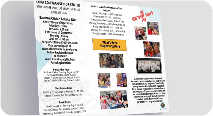 2100 BONNIE LANE, LAS VEGAS, NV 89156 (702) 455-7617 CORA COLEMAN SENIOR CENTER Serves Older Adults 50+ Center Hours of Operation: Monday - Friday 7:15 am - 5:00 pm Pool Hours of Operation: Monday - Friday 8:00 am - 2:00 pm (702) 455-2120 or (702) 455-8508 Visit our webpage at www.clarkcountynv.gov/parks Online Registration can be found at: www.ClarkCountyNV.Gov/ ParksRegistration Registration Dates: Session 6: Online: Thursday, August 14, 2025 Session 6: Monday, August 18, 2025 Session 7: Online: Thursday, October 9, 2025 Session 7: Walk-in: Monday, October 13, 2025 Wii LOVE TO LIVE, Laugh & Play Clark County Department of Parks and Recreation welcomes individuals of all abilities to participate in our programs. We will fully comply with the Americans with Disabilities Act in making reasonable accommodations to encourage participants in our programs. We are committed to provide assistance to those with mental and physical disabilities who required special accommodation to participate in a program or activity. Center is CLOSED in observance of the holidays Monday, September 1, 2025 - Labor Day Friday, October 31, 2025 - Nevada Day Tuesday, November 11, 2025 - Veteran’s Day Thursday, November 27, 2025 - Thanksgiving Day Friday, November 28, 2025 - Family Day Thursday, December 25, 2025 - Christmas Day Thursday, January 1, 2026 - New Years Day Class Session Dates Session 6: Tuesday, Sept. 2 - Monday, Oct. 13, 2025 Session 7: Monday, Oct. 27 - Tuesday, Dec. 16, Break Weeks Monday, August 18 - Saturday, August 30, 2025 Tuesday, October 14 - Saturday, October 25, 2025, Wednesday, December 17 - Saturday, January 3, 2026 What’s Been Happening Here