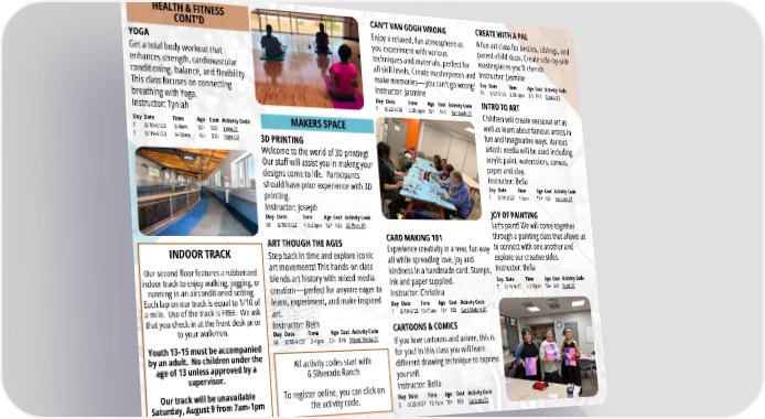 INDOOR TRACK Our second floor features a rubberized indoor track to enjoy walking, jogging, or running in an airconditioned setting. Each lap on our track is equal to 1/10 of a mile. Use of the track is FREE. We ask that you check in at the front desk prior to your walk/run. Youth 13-15 must be accompanied by an adult. No children under the age of 13 unless approved by a supervisor. Our track will be unavailable Saturday, August 9 from 7am-1pm All activity codes start with 6 Silverado Ranch To register online, you can click on the activity code. MAKERS SPACE 3D PRINTING Welcome to the world of 3D printing! Our staff will assist you in making your designs come to life. Participants should have prior experience with 3D printing. Instructor: Joseph Day Date Time Age Cost Activity Code M 8/18-9/22 4-5:30pm 12+ $36 3D Print 01 ART THOUGH THE AGES Step back in time and explore iconic art movements! This hands-on class blends art history with mixed media creation—perfect for anyone eager to learn, experiment, and make inspired art. Instructor: Beth Day Date Time Age Cost Activity Code M 8/18-9/22 2-4 pm 20+ $40 Mixed Media 01 CAN’T VAN GOGH WRONG Enjoy a relaxed, fun atmosphere as you experiment with various techniques and materials, perfect for all skill levels. Create masterpieces and make memories—you can’t go wrong! Instructor: Jasmine Day Date Time Age Cost Activity Code F 8/22-9/26 3:30-5pm 18+ $41 Van Gogh 01 HEALTH & FITNESS CONT’D YOGA Get a total body workout that enhances strength, cardiovascular conditioning, balance, and flexibility. This class focuses on connecting breathing with Yoga. Instructor: Tyniah Day Date Time Age Cost Activity Code T 8/19-9/23 8-9am 50+ $35 Yoga 01 T 8/19-9/23 9-10am 16+ $35 Yoga 02 CARD MAKING 101 Experience creativity in a new, fun way all while spreading love, joy and kindness in a handmade card. Stamps, ink and paper supplied. Instructor: Christina Day Date Time Age Cost Activity Code T 8/19-9/23 10-11am 18+ $35 Card Making 01 CARTOONS & COMICS If you love cartoons and anime, this is for you! In this class you will learn different drawing technique to express yourself. Instructor: Bella Day Date Time Age Cost Activity Code S 8/23-9/27 12-1pm 10+ $35 Cartoons 01 CREATE WITH A PAL A fun art class for besties, siblings, and parent-child duos. Create side-by-side masterpieces you’ll cherish. Instructor: Jasmine Day Date Time Age Cost Activity Code Th 8/21-9/25 3:30-5pm 3-5 $41 Create 01 INTRO TO ART Children will create seasonal art as well as learn about famous artists in fun and imaginative ways. Various artistic media will be used including acrylic paint, watercolors, canvas, paper and clay. Instructor: Bella Day Date Time Age Cost Activity Code T 8/19-9/23 4-5pm 10+ $35 Intro Art 01 JOY OF PAINTING Let's paint! We will come together through a painting class that allows us to connect with one another and explore our creative sides. Instructor: Bella Day Date Time Age Cost Activity Code T 8/19-9/23 1-2:30pm 50+ $41 Paint 01