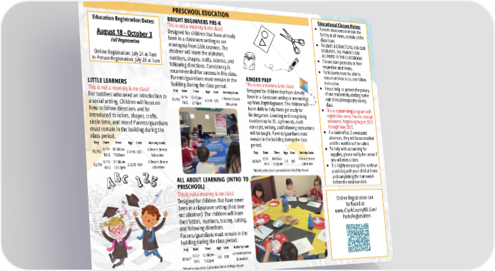 Online Registration can be found at: www.ClarkCountyNV.Gov/ ParksRegistration PRESCHOOL EDUCATION Educational Classes Notes: Parents must remain inside the facility at all times, outside of the classroom. TO LIMIT DISTRACTIONS FOR OUR STUDENTS, NO PARENTS ARE ALLOWED IN THE CLASSROOM. Classes start promptly at their respective start times. Participants must be able to remain in their seats and follow instruction. Please help us protect the privacy of our students by abiding to the rule of no photography during class. This is a year-long program with registration every 7 weeks (except summers). Beginning August 2025 through May 2026. If a student has 3 unexcused absences, they will be unenrolled and the waitlist will be called. To help with accounting for supplies, please notify the center if you will miss a class. It is highly encouraged to continue practicing with your child at home and completing the homework before the next due date. Education Registration Dates: August 18 - October 3 Fall Registration Online Registration: July 24 at 7am In-Person Registration: July 28 at 7am LITTLE LEARNERS This is not a mommy & me class! For toddlers who need an introduction to a social setting. Children will focus on how to follow directions and be introduced to colors, shapes, crafts, circle time, and more! Parents/guardians must remain in the building during the class period. ALL ABOUT LEARNING (INTRO TO PRESCHOOL) This is not a mommy & me class! Designed for children that have never been in a classroom setting (first time socialization). The children will learn their letters, numbers, tracing, cutting, and following directions. Parents/guardians must remain in the building during the class period. KINDER PREP This is not a mommy & me class! Designed for children that have already been in a classroom setting or are moving up from Bright Beginners. The children will learn skills to help them get ready for kindergarten. Counting and recognizing numbers up to 30, sight words, math concepts, writing, and following instructions will be taught. Parents/guardians must remain in the building during the class period. BRIGHT BEGINNERS PRE-K This is not a mommy & me class! Designed for children that have already been in a classroom setting or are moving up from Little Learners. The children will learn the alphabet, numbers, shapes, crafts, science, and following directions. Consistency is recommended for success in this class. Parents/guardians must remain in the building during the class period. Day Date Time Age Cost Activity Code TU/TH 8/19- 10/2 10:00am- 11:00am 2-2.99 $54 6 Desert Breeze Education TU/TH 8/19- 10/2 11:30am- 12:30pm 2-2.99 $54 6 Desert Breeze Education Day Date Time Age Cost Activity Code TU/TH 8/19- 10/2 12:45pm- 2:15pm 3-3.99 $72 6 Desert Breeze Education Day Date Time Age Cost Activity Code M/W/F 8/22- 10/3 12:00pm- 1:30pm 4-5 $95 6 Desert Breeze Education *Monday class price is prorated due to holiday closure. Day Date Time Age Cost Activity Code M/W/F 8/22- 10/3 10:00am- 11:30am 4-5 $95 6 Desert Breeze Education *Monday class price is prorated due to holiday closure.