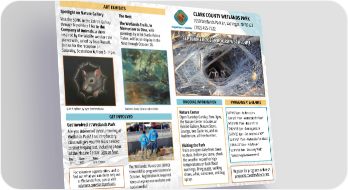 ONGOING INFORMATION PROGRAMS AT A GLANCE ART EXHIBITS GET INVOLVED 7050 Wetlands Park Ln, Las Vegas, NV 89122 (702) 455-7522 CLARK COUNTY WETLANDS PARK Nature Center Open Tuesday-Sunday, 9am-3pm, the Nature Center includes an Exhibit Gallery, Nature Store, Lounge, two Galleries, and an Auditorium, all free to enter. Visiting the Park Trails are open daily from dawn to dusk. Before you come, check the weather report for high temperatures or flash flood warnings. Bring water, walking shoes, a hat, sunscreen, and bug spray. SEPTEMBER 2025 PROGRAM SCHEDULE SEPTEMBER 2025 PROGRAM SCHEDULE SAT 9/6 5pm - Art Reception SUN 9/7 11am - Watercolor for Kids* WED 9/10 11am - Nature Tales THU 9/18 6pm - Evening Lecture SAT 9/20 1pm - Get Involved at WP* SUN 9/21 11am - Watercolor for Adults* SUN 9/28 10am - Kids Create* SUN 9/28 9am - Discovery Walk* *Advance registration required. Register for programs online at programs.ccwetlandspark.com. Spotlight on Nature Gallery For volunteer opportunities, and to find out what you can do to help out at Wetlands Park, please visit volunteer.ccwetlandspark.com. The Nest The Wetlands: Hands On! (WHO) stewardship program resumes in October. Registration is required. Keep an eye on our website and social media! Visit the SONG in the Exhibit Gallery through November 1 for In the Company of Animals, a show inspired by the wildlife we share the planet with, juried by Sean Russell. Join us for the reception on Saturday, September 6, from 5 - 7 pm. The Wetlands Trails, In Memoriam to Dina, with paintings by artist Stasia Valora Fisher, will be on display in the Nest through October 26. Wetlands Brook, by Stasia Valora Fisher Quiet Neighbor, by Iryna Borshchahivska © Philip Martini Get Involved at Wetlands Park Are you interested in volunteering at Wetlands Park? This introductory class will give you the tools needed to start helping out, including a tour of the Nature Center. Sign up here. Day Date Time Sa 9/20 1pm-2:30pm © Wetlands
