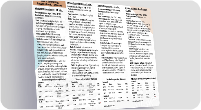 Youth Swimming Lessons Cont. - 3 Weeks Water Independence - 30 min. Recommended Age: 3 YRS - 8 YRS Participant Ratio: 1 instructor to 6 participants Pool Location: Family Pool (0ft - 4ft) Skills Required to Enter:1) Separate from a parent/guardian while taking part in group activities 2) Listen & take direction in a group setting Class Goals: To build basic water competency with minimal support. Skills Included: Safe water entry & exit, blowing bubbles, bobs, relaxed submersion, rolling from front to back floats, streamlines on front & back, flutter kicks on front & back, proper kickboard use, basic freestyle, finning on back, jumping into water with submersion, and basic water safety skills. Skills Required to Pass: 1) Jump into water, completely submerge head, resurface, and exit the pool using ladder or stairs 2) Start 10 ft. away from wall or stairs: front float for 5 seconds, roll over to a back float for 5 seconds, then swim back to start with minimal support Stroke Introduction - 45 min. Recommended Age: 5 YRS - 9 YRS Participant Ratio: 1 instructor to 6 students Pool Location: Family Pool & Lap Pool (5 to 7 feet) Skills Required to Enter: 1) Jump into water, completely submerge head, resurface, and exit the pool using ladder or stairs 2) Start 10 ft. away from wall or stairs: front float for 5 seconds, roll over to a back float for 5 seconds, then swim back to start with minimal support Class Goals: To refine freestyle, introduce backstroke, swim without any support, and build confidence entering the lap pool. Skills Included: Independent air recovery, rolling to back as air recovery for freestyle, longer distances for freestyle, basic backstroke, changing direction while swimming, feet-first deep water entries, introduction to treading, and basic water safety skills. Skills Required to Pass: 1) Jump into lap pool and return to the wall 2) Swim approx. 12 yards of freestyle independently 3) Swim approx. 12 yards of backstroke independently Water Independence (30mins) Session 7A Day Dates Times Cost M/W 10/6 - 10/22 4:00pm, 5:00pm $30 6:00pm T/TH 10/7 - 10/23 4:00pm, 5:00pm $30 6:00pm SAT 10/11 - 11/15 8:15am $30 Session 7B M/W 10/27 - 11/12 4:00pm, 5:00pm, $30 6:00pm T/TH 10/28 - 11/13 4:00pm, 5:00pm, $25* 6:00pm Activity Code: 752101 Stroke Introduction (45mins) Session 7A Day Dates Times Cost M/W 10/6 - 10/22 4:00pm, 5:00pm $30 6:00pm T/TH 10/7 - 10/23 4:00pm, 5:00pm $30 6:00pm SAT 10/11 - 11/15 9:00am $30 Session 7B M/W 10/27 - 11/12 4:00pm, 5:00pm, $30 6:00pm T/TH 10/28 - 11/13 4:00pm, 5:00pm, $25* 6:00pm Activity Code: 752102 Stroke Progression - 45 min. Recommended Age: 6 YRS - 12 YRS Participant Ratio: 1 instructor to 8 students Pool Location: Lap Pool (5 to 7 feet) Skills Required to Enter: 1) Jump into lap pool and return to the wall 2) Swim approx. 12 yards of freestyle independently 2) Swim approx. 12 yards of backstroke independently Class Goals: To refine basic swimming strokes to achieve proficiency (freestyle & backstroke), review treading, and to introduce elementary backstroke and breaststroke. Skills Included: Side breathing for freestyle to improve proficiency & endurance, refined backstroke, elementary backstroke, breaststroke, basic treading, and basic water safety skills. Skills Required to Pass: 1) Jump into lap pool, fully submerge, swim 12 yards of backstroke, turn around and swim freestyle with effective side breathing, then exit the pool 2) Swim 12 yards of elementary backstroke 3) Tread for 15 seconds with head above the water Advanced Stroke Development - 45 min. Recommended Age: 7 YRS - 12 YRS Participant Ratio: 1 instructor to 10 students Pool Location: Lap Pool (7 feet) Skills Required to Enter: 1) Jump into lap pool, fully submerge, swim 12 yards of backstroke, turn around and swim freestyle with effective side breathing, then exit the pool 2) Swim 12 yards of elementary backstroke 3) Tread for 15 seconds with head above the water Class Goals: To refine all basic swimming stokes and treading to proficiency, and to introduce sidestroke, butterfly, sitting and kneeling dives. Skills Included: Refined elementary backstroke & breaststroke, introduce sidestroke, proficient treading with sculling and eggbeater kick, butterfly, sitting & kneeling dives, and basic water safety skills. Skills Required to Pass: 1) Tread for 1 minute 2) 5 strokes of butterfly 3) 25 yards of breaststroke 4) 25 yards of freestyle w/ effective side breathing 5) 25 yards of backstroke 6) 25 yards of elementary backstroke Stroke Progression (45mins) Session 7A Day Dates Times Cost M/W 10/6 - 10/22 5:00pm $30 T/TH 10/7 - 10/23 6:00pm,7:00pm $30 SAT 10/11 - 11/15 9:00am $30 Session 7B M/W 10/27 - 11/12 5:00pm $30 T/TH 10/28 - 11/13 6:00pm, 7:00pm $25* Activity Code: 752103 Advanced Stroke Development (45mins) Session 7A Day Dates Times Cost M/W 10/6 - 10/22 6:00pm $30 T/TH 10/7 - 10/23 7:00pm $30 SAT 10/11 - 11/15 10:00am $30 Session 7B M/W 10/27 - 11/12 6:00pm $30 T/TH 10/28 - 11/13 7:00pm $25* Activity Code: 752104