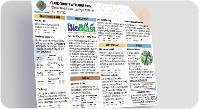 FAMILY PROGRAMS ART PROGRAMS Register for programs online at programs.ccwetlandspark.com. FITNESS SPRING EVENT 7050 Wetlands Park Ln, Las Vegas, NV 89122 (702) 455-7522 CLARK COUNTY WETLANDS PARK Nature Tales Day Date Time Age W 4/9 11am -12pm All Experience nature through art and have fun while learning kid-friendly watercolor painting and drawing skills. The theme this month is birds in flight. All supplies are provided. Sign up here. Day Date Time Age Cost Su 4/6 11am-12pm 4-17 $5 Nature-themed story and craft program. Free and walk-in. Watercolor for Kids Accessibility Notice Wetlands Park welcomes people of all abilities. If you are in need of a program modification, please call (702) 455-7522 two weeks prior to the program date. Wetlands Explorers Outdoor program for younger kids with age-appropriate activities for all participants. Parental participation required. Themes vary by day and time. Sign up here. Bees & Me! Day Date Time Age Cost W 4/2 10-11:30am 3-8 $5 Wetlands Walkers A walk in nature is better than a treadmill. Our goal this year is to collectively walk a total of 5,700 miles, the same as the Green Darner Dragonfly’s multigenerational migration journey. Can you help us reach our goal? Log your hours and earn rewards at walkers.ccwetlandspark.com. Tabletops Join a park naturalist in the Exhibit Gallery for a free, drop-in display about plants found at Wetlands Park and a native seed cleaning activity. Day Date Time Age Su 4/13 10am-12pm All Watercolor for Adults Day Date Time Age Cost Su 4/20 11am-12:30pm 18+ $10 A beginning and intermediate watercolor trials class that encourages students to explore different techniques. Each class will focus on a specific nature theme/topic. This month’s theme is birds in flight. All supplies are provided, but feel free to bring your own! Sign up here. Learn about the plants and animals of Wetlands Park! This free, walk-in event will offer Science Stations, where guest scientists and naturalists will help you find and identify fish, bugs, plants, birds, and mammals. The Nature Center will feature lots of games and activities, too! The event includes observation of World Migratory Bird Day, coordinated annually by Environment for the Americas. For more information, please visit events.ccwetlandspark.com. Sat., April 26, 2025 9 am - 1 pm Lively Ladybugs Day Date Time Age Cost Sa 4/12 1-2:30pm 3-8 $5 Earth Day Can Be Every Day! Day Date Time Age Cost W 4/16 10-11:30am 3-8 $5 Turtley Awesome! Day Date Time Age Cost W 4/30 10-11:30am 3-8 $5 WALKS Join a park naturalist to explore the Wetlands on a guided walk! Themes vary by date. Sign up here. Creatures of the Moon Day Date Time Age Cost Sa 4/12 7-9pm 8+ $5 Women’s Walk in the Wetlands: Birding Day Date Time Age Cost F 4/11 8:30-10am All $5 Invasive Basket Workshop Make a basket out of invasive plants and debris in this workshop instructed by our 2025 Artist in Residence, Megan Heeres. Free, but register in advance at the Exhibit Gallery - space is limited. Day Date Time Age Sa 4/5 10am-12pm 10+ Discovery Walks Day Date Time Age Cost Sa 4/19 7-9am 10+ $5 Java Jaunt Birding Walk with a Red Rock Audubon Society birding expert and a Wetlands Park naturalist to spot resident and migratory birds. For both beginner and experienced birders. Binoculars available to borrow. Sign up here.