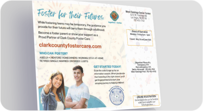 ONLINE REGISTRATION Online Registration can be found at: www.ClarkCountyNV.Gov/ ParksRegistration Hours of Operation Monday - Friday 8am - 5pm Closed: May 26 and June 19th West Flamingo Senior Center 6255 W. Flamingo Rd Las Vegas, NV 89103 702-455-7742 Important Phone #’s: Emergency: 911 Non-emergency: 311 Senior Advocate: 702-455-7051 West Flamingo Pool: 702-455-4192 West Flamingo Senior Center 6255 W. Flamingo Rd West Flamingo Senior Center 6255 W. Flamingo Rd West Flamingo Senior Center Las Vegas, NV 89103 702-455-7742 Important Phone #’s: Emergency: 911 Non-emergency: 311 Emergency: 911 Non-emergency: 311 Emergency: 911 Senior Advocate: Non-emergency: 311 Senior Advocate: Non-emergency: 311 702-455-7051 Non-emergency: 311 702-455-7051 Non-emergency: 311 West Flamingo Pool: 702-455-4192 Hours of Operation Monday - Friday 8am - 5pm Closed: May 26 and June 19th ONLINE REGISTRATION Online Registration can be found at: www.ClarkCountyNV.Gov/ ParksRegistration ParksRegistration