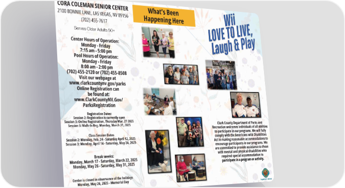 2100 BONNIE LANE, LAS VEGAS, NV 89156 (702) 455-7617 CORA COLEMAN SENIOR CENTER Serves Older Adults 50+ Center Hours of Operation: Monday - Friday 7:15 am - 5:00 pm Pool Hours of Operation: Monday - Friday 8:00 am - 2:00 pm (702) 455-2120 or (702) 455-8508 Visit our webpage at www.clarkcountynv.gov/parks Online Registration can be found at: www.ClarkCountyNV.Gov/ ParksRegistration Registration Dates: Session 2: Registration is currently open Session 3: Online Registration, Thursday Mar. 27 2025 Session 3: Walk-In Reg. Monday, March 31, 2025 Class Session Dates Session 2: Monday, Feb. 24 - Saturday April 12, 2025 Session 3: Monday, April 14 - Saturday, May 24, 2025 Break weeks: Monday, March 17 - Saturday, March 22, 2025 Monday, May 26 - Saturday, May 31, 2025 Center is closed in observance of the holidays Monday, May 26, 2025 - Memorial Day What’s Been Happening Here Clark County Department of Parks and Recreation welcomes individuals of all abilities to participate in our programs. We will fully comply with the Americans with Disabilities Act in making reasonable accommodations to encourage participants in our programs. We are committed to provide assistance to those with mental and physical disabilities who required special accommodation to participate in a program or activity. 2100 BONNIE LANE, LAS VEGAS, NV 89156 (702) 455-7617 CORA COLEMAN SENIOR CENTER Serves Older Adults 50+ Center Hours of Operation: Monday - Friday 7:15 am - 5:00 pm Pool Hours of Operation: Monday - Friday 8:00 am - 2:00 pm (702) 455-2120 or (702) 455-8508 Visit our webpage at www.clarkcountynv.gov/parks Online Registration can Online Registration can be found at: be found at: www.ClarkCountyNV.Gov/ www.ClarkCountyNV.Gov/ ParksRegistration ParksRegistration Registration Dates: Registration Dates: Session 2: Registration is currently open Session 2: Registration is currently open Session 3: Online Registration, Thursday Mar. 27 2025 Session 3: Online Registration, Thursday Mar. 27 2025 Session 3: Walk-In Reg. Monday, March 31, 2025 Session 3: Walk-In Reg. Monday, March 31, 2025 Class Session Dates Session 2: Monday, Feb. 24 - Saturday April 12, 2025 Session 3: Monday, April 14 - Saturday, May 24, 2025 Break weeks: Monday, March 17 - Saturday, March 22, 2025 Monday, May 26 - Saturday, May 31, 2025 Center is closed in observance of the holidays Monday, May 26, 2025 - Memorial Day Monday - Friday 8:00 am - 2:00 pm (702) 455-2120 or (702) 455-8508 (702) 455-2120 or (702) 455-8508 (702) 455-2120 or (702) 455-8508 Visit our webpage at www.clarkcountynv.gov/parks www.clarkcountynv.gov/parks www.clarkcountynv.gov/parks www.clarkcountynv.gov/parks Online Registration can Online Registration can Online Registration can Online Registration can www.ClarkCountyNV.Gov/ www.ClarkCountyNV.Gov/ ParksRegistration Session 2: Registration is currently open Clark County Department of Parks and Recreation welcomes individuals of all abilities to participate in our programs. We will fully comply with the Americans with Disabilities Act in making reasonable accommodations to encourage participants in our programs. We are committed to provide assistance to those with mental and physical disabilities who required special accommodation to participate in a program or activity. 2100 BONNIE LANE, LAS VEGAS, NV 89156 CORA COLEMAN SENIOR CENTER Center Hours of Operation: Pool Hours of Operation: (702) 455-2120 or (702) 455-8508 www.clarkcountynv.gov/parks www.ClarkCountyNV.Gov/ Session 2: Registration is currently open Session 3: Online Registration, Thursday Mar. 27 2025 Session 3: Walk-In Reg. Monday, March 31, 2025 Session 3: Walk-In Reg. Monday, March 31, 2025 Session 2: Monday, Feb. 24 - Saturday April 12, 2025 Session 2: Monday, Feb. 24 - Saturday April 12, 2025 Session 3: Monday, April 14 - Saturday, May 24, 2025 Session 3: Monday, April 14 - Saturday, May 24, 2025 Monday, March 17 - Saturday, March 22, 2025 Monday, May 26 - Saturday, May 31, 2025 What’s Been Happening Here What’s Been Happening Here