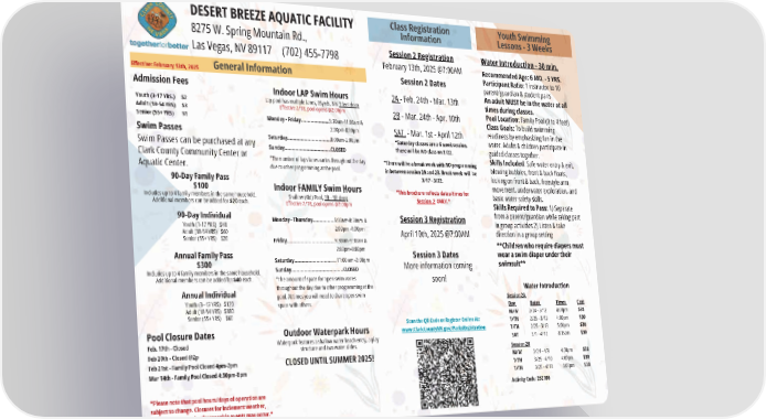 General Information Class Registration Information Youth Swimming Lessons - 3 Weeks Monday - Friday.....................5:30am-11:00am & 2:00pm-8:00pm Saturday................................8:00am-2:00pm Sunday..................................CLOSED *The number of laps lanes varies throughout the day due to other programming at the pool. Indoor LAP Swim Hours Lap pool has multiple lanes, 25yrds, & is 7 feet deep Effective 2/18, pool opens @2:00pm Session 2 Registration February 13th, 2025 @7:00AM 2A - Feb. 24th - Mar. 13th 2B - Mar. 24th - Apr. 10th SAT. - Mar. 1st - April 12th *Saturday classes are a 6 week session. There will be NO class on 3/22. Session 2 Dates Scan the QR Code or Register Online At: www.ClarkCountyNV.gov/ParksRegistration *This brochure reflects dates/times for Session 2 ONLY.* 8275 W. Spring Mountain Rd., Las Vegas, NV 89117 (702) 455-7798 DESERT BREEZE AQUATIC FACILITY Admission Fees Youth (3-17 YRS.) $2 Adult (18-54 YRS) $3 Senior (55+ YRS) $1 Swim Passes Swim Passes can be purchased at any Clark County Community Center or Aquatic Center. 90-Day Family Pass $100 Includes up to 4 family members in the same household. Additional members can be added for $20 each. 90-Day Individual Youth (3-17 YRS) $40 Adult (18-54 YRS) $60 Senior (55+ YRS) $20 Annual Family Pass $300 Includes up to 4 family members in the same household. Additional members can be added for $40 each. Annual Individual Youth (3--17 YRS) $120 Adult (18-54 YRS) $180 Senior (55+ YRS) $60 Pool Closure Dates Feb. 17th - Closed Feb 20th - Closed @2p Feb 21st - Family Pool Closed 4pm-7pm Mar 14th - Family Pool Closed 4:30pm-8pm *Please note that pool hours/days of operation are subject to change. Closures for inclement weather, special events, and unforeseeable events may occur.* Water Introduction - 30 min. Recommended Age: 6 MO. - 5 YRS. Participant Ratio: 1 instructor to 10 parent/guardian & student pairs An adult MUST be in the water at all times during classes. Pool Location: Family Pool (0 to 4 feet) Class Goals: To build swimming readiness by emphasizing fun in the water. Adults & children participate in guided classes together. Skills Included: Safe water entry & exit, blowing bubbles, front & back floats, kicking on front & back, freestyle arm movement, underwater exploration, and basic water safety skills. Skills Required to Pass: 1) Separate from a parent/guardian while taking part in group activities 2) Listen & take direction in a group setting **Children who require diapers must wear a swim diaper under their swimsuit** Water Introduction Session 2A Day Dates Times Cost M/W 2/24 - 3/12 4:00pm $30 T/TH 2/25 - 3/13 4:00pm $30 T/TH 2/25 - 3/13 5:00pm $30 SAT 3/1 - 4/12 8:15am $30 Session 2B M/W 3/24 - 4/9 4:00pm $30 T/TH 3/25 - 4/10 4:00pm $30 T/TH 3/25 - 4/10 5:00pm $30 Activity Code: 252100 Indoor FAMILY Swim Hours Shallow (Kid) Pool, 3ft - 5ft deep Effective 2/18, pool opens @2:00pm Monday - Thursday................5:30am-8:30am & 2:00pm -4:00pm Friday...................................5:30am-9:30am & 2:00pm-8:00pm Saturday................................11:00 am -2:00pm Sunday......................................CLOSED *The amount of space for open swim varies throughout the day due to other programming at the pool. At times you will need to share open swim space with others. CLOSED UNTIL SUMMER 2025! Outdoor Waterpark Hours Waterpark features a shallow water beach entry, a play structure and two water slides. Effective: February 13th, 2025 *There will be a break week with NO programming in between session 2A and 2B. Break week will be 3/17 - 3/22. Session 3 Registration April 10th, 2025 @7:00AM More information coming soon! Session 3 Dates Monday - Friday.....................5:30am-11:00am & 2:00pm-8:00pm Saturday................................8:00am-2:00pm Sunday..................................CLOSED *The number of laps lanes varies throughout the day due to other programming at the pool. Indoor LAP Swim Hours Lap pool has multiple lanes, 25yrds, & is 7 feet deep 7 feet deep Effective 2/18, pool opens @2:00pm Session 2 Registration Session 2 Registration February 13th, 2025 @7:00AM 2A - Feb. 24th - Mar. 13th 2B - Mar. 24th - Apr. 10th SAT. - Mar. 1st - April 12th *Saturday classes are a 6 week session. There will be NO class on 3/22. Session 2 Dates Scan the QR Code or Register Online At: www.ClarkCountyNV.gov/ParksRegistration www.ClarkCountyNV.gov/ParksRegistration *This brochure reflects dates/times for Session 2 ONLY.* 8275 W. Spring Mountain Rd., Las Vegas, NV 89117 (702) 455-7798 DESERT BREEZE AQUATIC FACILITY Admission Fees Youth (3-17 YRS.) $2 Adult (18-54 YRS) $3 Senior (55+ YRS) $1 Swim Passes Swim Passes can be purchased at any Clark County Community Center or 90-Day Family Pass $100 Includes up to 4 family members in the same household. Additional members can be added for $20 each. 90-Day Individual Youth (3-17 YRS) $40 Adult (18-54 YRS) $60 Senior (55+ YRS) $20 Annual Family Pass $300 Includes up to 4 family members in the same household. Additional members can be added for $40 each. Annual Individual Youth (3--17 YRS) $120 Adult (18-54 YRS) $180 Senior (55+ YRS) $60 Pool Closure Dates Feb. 17th - Closed Feb 20th - Closed @2p Feb 21st - Family Pool Closed 4pm-7pm Mar 14th - Family Pool Closed 4:30pm-8pm *Please note that pool hours/days of operation are subject to change. Closures for inclement weather, special events, and unforeseeable events may occur.* Water Introduction - 30 min. Recommended Age: 6 MO. - 5 YRS. Participant Ratio: parent/guardian & student pairs An adult MUST be in the water at all times during classes. Pool Location: Class Goals: To build swimming readiness by emphasizing fun in the water. Adults & children participate in guided classes together. Skills Included: Safe water entry & exit, blowing bubbles, front & back floats, kicking on front & back, freestyle arm movement, underwater exploration, and basic water safety skills. Skills Required to Pass: 