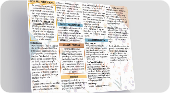 SENIOR PROGRAM 50+ FACILITY RESERVATIONS DISCOUNT PROGRAM The Parks and Recreation Scholarship program provides financial assistance for classes, sports leagues, and fitness room memberships to qualifying Clark County residents. To apply please ask for an application at the front desk of the center. Please allow 2 weeks for application processing and approval. REFUNDS Bingo Breakfast Mark your calendars for the last Friday of every month and join us for a morning of fun and prizes at our Breakfast Bingo event! We'll be serving up a delicious breakfast from 10 AM to 12:30 PM as you play your favorite game. Field Trips / Workshops For the latest information on upcoming workshops and field trips, visit the Cambridge Recreation Center front desk or check our website. New schedules are released bimonthly on the same day as our Friday Breakfast Bingo events. Don’t miss out on these exciting opportunities! OPEN REC / AFTER SCHOOL The after school program is an open/supervised recreation program which provides activities, gym usage, workshops, arts n crafts for youth ages 6-17 years old. Program is Tuesday - Friday from 2:00 PM - 6:00 PM. THIS PROGRAM IS FREE! All children attending must have a waiver on file signed by a parent/guardian. All participants are required to wear closed toe shoes while participating in after school recreation activities. Are you looking for a place to hang out, relax, and have fun with friends? The Bridge Lounge is open just for teens, offering a perfect spot to enjoy some downtime. With foosball, ping pong, arcade gaming, and a TV for movies and shows, there's something for everyone. Plus, we have a variety of board games available if you're in the mood for some classic fun. Whether you're here to challenge your friends to a game or just unwind, the Bridge Lounge is the place to be. Bridge Lounge Kidsville Come on down to Kidsville, where fun never ends! Dive into a world of awesome board games, get creative with colorful coloring pages, or jump on one of our computers to play your favorite games. Whether you're a master artist, a game guru, or just want to chill with friends, Kidsville is the place to be. So grab your friends and join the fun—adventures await at Kidsville! Cambridge offers affordable rooms for your next event. We have several spaces available for your facility use needs. Reservations request forms are available at the front desk. Please give 2 WEEK NOTICE for rental requests. Refunds will be made first to accommodate each individual or group by transferring use to a similar program or facility before issuing a refund. Refunds are available based on the following criteria: If a class or program is cancelled by the department a full refund will be given. If a class registration is cancelled by individual prior to close of first day of class 100% refund will be given; after the first day of class no refund. Reservations cancelled by individual/group 30 days prior to use receive 100% refund, 21 days prior 75% refund, 14 days prior 50% given, and less than 14 days prior to use nor refund. week for Game Day, where seniors come together to enjoy board games and great company! This regular gathering is a chance to feel young again, connect with friends, and have fun playing a variety of games. All are welcome to share in the laughter and camaraderie each week! Wednesdays| Wii Bowling - Perfect for seniors, this activity is a great way to stay active, enjoy friendly competition, and socialize with fellow participants. No experience needed—just come ready for a good time and lots of laughs. Thursdays|Deaf Seniors - From poker games on a teleprompter to festive holiday potlucks, there's always something exciting happening. Whether you’re looking to relax, socialize, or enjoy some friendly competition, we’d love to see you there! Tuesdays | Game Day - Join us every Senior Days Bingo Breakfast Mark your calendars for the last Friday of every month and join us for a morning of fun and prizes at our Breakfast Bingo event! We'll be serving up a delicious breakfast from 10 AM to 12:30 PM as you play your favorite game. Field Trips / Workshops For the latest information on upcoming workshops and field trips, visit the Cambridge Recreation Center front desk or check our website. New schedules are released bimonthly on the same day as our Friday Breakfast Bingo events. Don’t miss out on these exciting opportunities! Are you looking for a place to hang out, Are you looking for a place to hang out, relax, and have fun with friends? The relax, and have fun with friends? The Bridge Lounge is open just for teens, Bridge Lounge is open just for teens, offering a perfect spot to enjoy some offering a perfect spot to enjoy some downtime. With foosball, ping pong, downtime. With foosball, ping pong, arcade gaming, and a TV for movies arcade gaming, and a TV for movies and shows, there's something for everyone. Plus, we have a variety of board games available if you're in the mood for some classic fun. Whether you're here to challenge your friends to a game or just unwind, the Bridge Lounge is the place to be. Kidsville Come on down to Kidsville, where fun never ends! Dive into a world of awesome board games, get creative with colorful coloring pages, or jump on one of our computers to play your favorite games. Whether you're a master artist, a game guru, or just want to chill with friends, Kidsville is the place to be. So grab your friends and join the fun—adventures await at Kidsville! Cambridge offers affordable rooms for your next event. We have several spaces available for your facility use needs. Reservations request forms are available at the front desk. Please give 2 WEEK NOTICE for rental requests. Refunds will be made first to Refunds will be made first to accommodate each individual or group accommodate each individual or group by transferring use to a similar by transferring use to a similar program or facility before issuing a program or facility befo