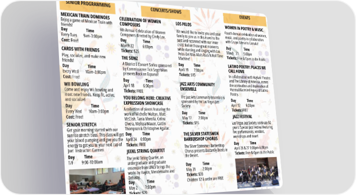 SENIOR PROGRAMMING CARDS WITH FRIENDS Play, socialize, and make new friends! Day Time Every Wed 10am-3:00pm Cost: Free! SENIOR STRETCH Get your morning started with our sunrise stretch class. This class will get your blood pumping and give you the energy to get you to your next cup of Joe! Instructor: Carmen Day Time T/F 9:00-10:00am WII BOWLING Come and enjoy Wii bowling and meet new friends. Keep fit, active, and socialize! Day Time Every Wed 10am-3:00pm Cost: Free! MEXICAN TRAIN DOMINOES Enjoy a game of Mexican Train with friends! Day Time Every Tues 9am-3:00pm Cost: Free! CONCERTS/SHOWS YOU BELONG HERE: CREATIVE EXPRESSION SHOWCASE A collection of pieces featuring the work of Michelle Walton, Matt McClish, Tania Merolla, Celina Olvera, Melissa Mauer, Caitlin Thompson & Christopher Aguilar. Day Time April 24 6:00pm Tickets: FREE LATINO POETRY: PLACES WE CALL HOME In collaboration with Asylum Theatre and The Library of America, comes the celebration and exploration of the multifacested legacy of Latino Poetry. Day Time April 12 6:00pm Tickets: FREE EVENTS JAZZ FESTIVAL Las Vegas Jazz Society celebrate 50 years! Special Jazz Festival featuring live performances, vendors, workshops and more! Day Time April 26 & 27 1:00pm-6:00pm Tickets: Free & Open to the Public LOS PELOS We would like to invite you and your family to join us in this travel to the past and reconnect with our inner child. Relive those great moments while dancing and singing with Los Pelos Del Más Alla’s Rock N Roll Time Machine! Day Time April 19 7:00pm Tickets: $15 JAZZ ARTS COMMUNITY ENSEMBLE The Jazz Arts Community Ensemble is sponsored by the Las Vegas Jazz Society. Day Time May 17 2:00pm Tickets: $15 CELEBRATION OF WOMEN COMPOSERS Day Time March 22 6:00pm Tickets: $25 6th Annual Celebration of Women Composers directed by Cindy Lee. THE SONZ A District E Concert Series sponsored by Commissioner Tick Segerblom presents Rock en Espanol! Day Time April 18 6:00pm Tickets: FREE WOMEN IN POETRY & MUSIC Fourth Annual celebration of women, music, and poetry in collaboration with Grupo Literario Comala! Day Time March 21 5:00pm Tickets: Free & Open to the Public JEEKL STRING QUARTET The Jeekl String Quartet, an undergraduate and graduate ensemble from UNLV brings the works by Haydn, Mendelssohn and Debussy. Day Time May 2 7:00pm Tickets: $20 THE SILVER STATESMEN BARBERSHOP CHORUS The Silver Statesmen Barbershop Chorus presents Dastardly Deeds in the Desert. Day Time May 31 2:00pm Tickets: $20 Children 12 & under are FREE SENIOR PROGRAMMING Day Every Every Wed 10am-3:00pm Cost: Cost: Free! Free! SENIOR STRETCH WII BOWLING WII BOWLING Come and enjoy Wii bowling and Come and enjoy Wii bowling and meet new friends. meet new friends. and socialize! and socialize! Day Every Every Wed Wed 10am-3:00pm Cost: Cost: Free! CONCERTS/SHOWS EVENTS
