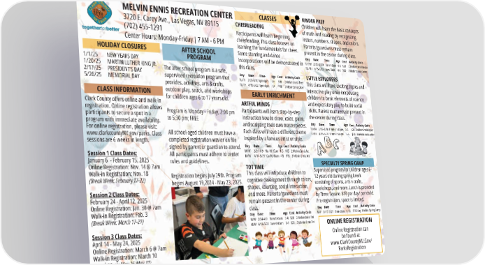 HOLIDAY CLOSURES CLASSES EARLY ENRICHMENT The after school program is a safe, supervised recreation program that provides, activities, arts & crafts, outdoor play, snack, and workshops for children ages 6 to 17 years old. Program is Monday - Friday, 2:00 pm to 5:30 pm; FREE All school-aged children must have a completed registration wavier on file signed by parent or guardian to attend. All participants must adhere to center rules and guidelines. Registration begins July 29th. Program begins August 19,2024 - May 23, 2025. CLASS INFORMATION Supervised program for children ages 6- 12 years old during spring break consisting of sports, arts n crafts, workshops, and more. Lunch is provided by Three Square. $10 per day/ per child. Pre-registration, space is limited. Day Date Time Age Cost Activity Code M-F 3/17-3/21 8am-2pm 6-12 $10/day Melvin SpringCamp 1/1/25 NEW YEARS DAY 1/20/25 MARTIN LUTHER KING JR. 2/17/25 PRESIDENT’S DAY 5/26/25 MEMORIAL DAY 3720 E. Carey Ave., Las Vegas, NV 89115 (702) 455-1291 MELVIN ENNIS RECREATION CENTER Clark County offers online and walk-in registration. Online registration allows participants to secure a spot in a program with immediate availability. For online registration, please visit: www.clarkcountyNV.gov/parks. Class sessions are 6 weeks in length. Session 1 Class Dates: January 6 - February 15, 2025 Online Registration: Nov. 14 @ 7am Walk-in Registration: Nov. 18 (Break Week: February 17-22) Session 2 Class Dates: February 24 - April 12, 2025 Online Registration: Jan. 30 @ 7am Walk-in Registration: Feb. 3 (Break Week: March 17-21) Session 3 Class Dates: April 14 - May 24, 2025 Online Registration: March 6 @ 7am Walk-in Registration: March 10 (Break Week: May 26-May 31) CHEERLEADING Participants will learn beginning cheerleading. This class focuses on learning the fundamentals for cheer. Some stunting and dance incorporations will be demonstrated in this class. Day Date Time Age Cost Activity Code TU/TH 2/25-4/10 5pm-6pm 6+ $18 2 Melvin Ennis Cheer TU/TH 4/15-5/22 5pm-6pm 6+ $18 3 Melvin Ennis Cheer ARTFUL MINDS Participants will learn step-by-step instruction how to draw, color, paint, and sculpting their own masterpieces. Each class will have a different theme inspired by a famous artist or style. Day Date Time Age Cost Activity Code M/W 2/24-4/9 10a-10:45am 4-5 $15 2 Melvin Ennis Art M/W 4/14-5/21 10a-10:45am 4-5 $15 3 Melvin Ennis Art Day Date Time Age Cost Activity Code M/W 2/24-4/9 9am-9:45am 3-4 $20 2 Melvin Ennis Tot M/W 4/14-5/21 9am-9:45am 3-4 $20 3 Melvin Ennis Tot SPECIALTY SPRING CAMP Center Hours: Monday-Friday | 7 AM - 6 PM AFTER SCHOOL PROGRAM TOT TIME This class will introduce children to cognitive development through colors, shapes, counting, social interaction, and more. Parents/guardians must remain present in the center during class. KINDER PREP Parents/guardians must remain present in the center during class. Children will learn the basic concepts of math and reading by recognizing letters, numbers, shapes, and colors. Day Date Time Age Cost Activity Code TU /TH 2/25-4/10 9am-10am 4-5 $20 2 MelvinEnnisKinder TU /TH 4/15-5/22 9am-10am 4-5 $20 3 Melvin Ennis Kinder LITTLE EXPLORERS This class will have exciting topics and interactive play while introducing children to basic elements of science and exploratory play to build social skills. Parent must remain present in the center during class. Day Date Time Age Cost Activity Code TU/TH 2/25-4/10 11am-11:45pm 3-5 $20 2MelvinEnnisExplor TU/TH 4/15-5/22 11am-11:45pm 3-5 $20 3MelvinEnnisExplor ONLINE REGISTRATION Online Registration can be found at: www.ClarkCountyNV.Gov/ ParksRegistration 1/1/25 NEW YEARS DAY 1/20/25 MARTIN LUTHER KING JR. 2/17/25 PRESIDENT’S DAY 5/26/25 MEMORIAL DAY 3720 E. Carey Ave., Las Vegas, NV 89115 (702) 455-1291 MELVIN ENNIS RECREATION CENTER Clark County offers online and walk-in registration. Online registration allows participants to secure a spot in a program with immediate availability. For online registration, please visit: For online registration, please visit: www.clarkcountyNV.gov/parks. Class www.clarkcountyNV.gov/parks. Class sessions are 6 weeks in length. sessions are 6 weeks in length. Session 1 Class Dates: - February 15, 2025 Online Registration: Nov. 14 @ 7am Online Registration: Nov. 14 @ 7am Walk-in Registration: Nov. 18 (Break Week: February 17-22) Session 2 Class Dates: February 24 - April 12, 2025 Online Registration: Jan. 30 @ 7am Walk-in Registration: Feb. 3 (Break Week: March 17-21) Session 3 Class Dates: April 14 - May 24, 2025 Online Registration: March 6 @ 7am Walk-in Registration: March 10 (Break Week: May 26-May 31) Center Hours: Monday-Friday | 7 AM - 6 PM HOLIDAY CLOSURES CLASS INFORMATION Clark County offers online and walk-in Clark County offers online and walk-in Clark County offers online and walk-in registration. Online registration allows registration. Online registration allows registration. Online registration allows registration. Online registration allows participants to secure a spot in a participants to secure a spot in a participants to secure a spot in a participants to secure a spot in a program with immediate availability. program with immediate availability. program with immediate availability. program with immediate availability. For online registration, please visit: For online registration, please visit: For online registration, please visit: For online registration, please visit: www.clarkcountyNV.gov/parks. Class www.clarkcountyNV.gov/parks. Class sessions are 6 weeks in length. sessions are 6 weeks in length. Session 1 Class Dates: Session 1 Class Dates: January 6 January 6 - February 15, 2025 Online Registration: Nov. 14 @ 7am Online Registration: Nov. 14 @ 7am CLASS INFORMATION Supervised program for children ages 6- 12 years old during spring break consisting of sports, arts n crafts, workshops, and more. Lunch is provided by Three Square. $10 per day/ per child. Pre-registration, space is limited. Day 