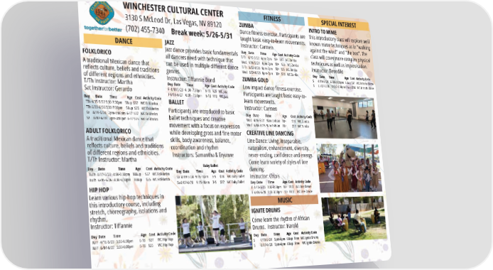DANCE FITNESS MUSIC SPECIAL INTEREST Baby Ballet Day Date Time Age Cost Activity Code Sa 4/19-5/24 9:15-10am 3-5 $18 WC Baby Ballet Sa 6/07-6/28 9:15-10am 3-5 $12 WC Baby Ballet 3130 S McLeod Dr, Las Vegas, NV 89120 (702) 455-7340 Break week: 5/26-5/31 WINCHESTER CULTURAL CENTER FOLKLORICO A traditional Mexican dance that reflects culture, beliefs and traditions of different regions and ethnicities. T/Th Instructor: Martha Sat Instructor: Gerardo Day Date Time Age Cost Activity Code TTh 4/15-5/22 5:30-7:30pm 5&up $37 WC Folklorico TTh 6/03-6/26 5:30-7:30pm 5&up $25 WC Folklorico Sa 4/19-5/24 2pm-4:00pm 6-17 $37 WC Folklorico Sa 6/07-6/28 2pm-4:00pm 6-17 $25 WC Folklorico JAZZ Jazz dance provides basic fundamentals all dancers need with technique that can be used in multiple different dance genres. Instructor: Tiffannie Bond Day Date Time Age Cost Activity Code F 4/18-5/23 6 :30- 7:30pm 6-18 $26 WC Jazz F 6/06-6/27 6:30 - 7:30pm 6-18 $18 WC Jazz BALLET ZUMBA Dance fitness exercise. Participants are taught basic easy-to-learn movements. Instructor: Carmen Day Date Time Age Cost Activity Code T/Th 4/15-5/22 6pm-7pm 18+ $37 WC Zumba Wed 4/16-5/21 6pm-7pm 18+ $26 WC Zumba T/Th 6/03-6/26 6pm-7pm 18+ $25 WC Zumba Wed 6/04-6/25 6pm-7pm 18+ $18 WC Zumba CREATIVE LINE DANCING Line Dance: Living, inseparable, naturalism, enhancement, diversity, never-ending, confidence and energy. Come learn variety of styles of line dancing. Instructor: Chlois Day Date Time Age Cost Activity Code F 4/18-5/23 1:30-3:30pm 18+ FREE WC Line Dance F 6/06-6/28 1:30-3:30pm 18+ FREE WC Line Dance IGNITE DRUMS Come learn the rhythm of African Drums. Instructor: Harold Day Date Time Age Cost Activity Code S 4/19-5/24 5pm-6pm 6&up Free WC Ignite Drums S 6/07-6/28 5pm-6pm 6&up Free WC Ignite Drums HIP HOP Learn various hip-hop techniques in this introductory course, including stretch, choreography, isolations and rhythm. Instructor: Tiffannie Day Date Time Age Cost Activity Code W/F 4/16-5/23 5:30-6:30pm 6-18 $37 WC Hip Hop W/F 6/04-6/27 5:30-6:00pm 6-18 $25 WC Hip Hop ADULT FOLKLORICO A traditional Mexican dance that reflects culture, beliefs and traditions of different regions and ethnicities. T/Th Instructor: Martha Day Date Time Age Cost Activity Code TuTh 4/17-5/22 4:30-5:30pm 18&up $37 WC Folklorico TuTh 6/05-6/26 4:30-5:30pm 18&up $25 WC Folklorico Participants are introduced to basic ballet techniques and creative movement with a focus on expression while developing gross and fine motor skills, body awareness, balance, coordination and rhythm Instructors: Samantha & Eryanne INTRO TO MIME This introductory class will explore well known mime techniques as in “walking against the wind” and “the box”. The class will cover more complex physical techniques as well as improvisation. Instructor: Benedikt Day Date Time Age Cost Activity Code S 4/19-5/24 12:30-1:30pm 6 &up $21 WC Intro to Mime S 6 /07-6/28 12:30-1:30pm 6 &up $18 WC Intro to Mime ZUMBA GOLD Low impact dance fitness exercise. Participants are taught basic easy-to- learn movements. Instructor: Carmen Day Date Time Age Cost Activity Code Wed 4/16-5/21 9am-9:45am 18+ $18 WC Zumba Wed 6/04-6/25 9am-9:45am 18+ $12 WC Zumba 3130 S McLeod Dr, Las Vegas, NV 89120 (702) 455-7340 WINCHESTER CULTURAL CENTER FOLKLORICO A traditional Mexican dance that reflects culture, beliefs and traditions of different regions and ethnicities. T/Th Instructor: Martha Sat Instructor: Gerardo Age Cost Activity Code TTh 4/15-5/22 5:30-7:30pm 5&up $37 WC Folklorico TTh 6/03-6/26 5:30-7:30pm 5&up $25 WC Folklorico 2pm-4:00pm 6-17 $37 WC Folklorico 2pm-4:00pm 6-17 $25 WC Folklorico JAZZ Jazz dance provides basic fundamentals all dancers need with technique that genres. Day Date S 4/19-5/24 S 6/07-6/28 HIP HOP Learn various hip-hop techniques in this introductory course, including stretch, choreography, isolations and rhythm. Instructor: Tiffannie Day Date Time Age Cost Activity Code W/F 4/16-5/23 5:30-6:30pm 6-18 $37 WC Hip Hop W/F 6/04-6/27 5:30-6:00pm 6-18 $25 WC Hip Hop ADULT FOLKLORICO ADULT FOLKLORICO A traditional Mexican dance that A traditional Mexican dance that reflects culture, beliefs and traditions reflects culture, beliefs and traditions of different regions and ethnicities. of different regions and ethnicities. T/Th Instructor: Martha Time Age Cost Activity Code Activity Code TuTh 4/17-5/22 4:30-5:30pm 18&up $37 WC Folklorico WC Folklorico TuTh 6/05-6/26 4:30-5:30pm 18&up $25 WC Folklorico WC Folklorico Participants are introduced to basic ballet techniques and creative movement with a focus on expression while developing gross and fine motor skills, body awareness, balance, coordination and rhythm DANCE Day Day Day Date Time TTh 4/15-5/22 5:30-7:30pm TTh 4/15-5/22 5:30-7:30pm TTh 4/15-5/22 5:30-7:30pm TTh 6/03-6/26 5:30-7:30pm TTh 6/03-6/26 5:30-7:30pm TTh 6/03-6/26 5:30-7:30pm Sa 4/19-5/24 4/19-5/24 4/19-5/24 4/19-5/24 2pm-4:00pm Sa 6/07-6/28 2pm-4:00pm 2pm-4:00pm 2pm-4:00pm 2pm-4:00pm ADULT FOLKLORICO ADULT FOLKLORICO ADULT FOLKLORICO ADULT FOLKLORICO A traditional Mexican dance that A traditional Mexican dance that reflects culture, beliefs and traditions reflects culture, beliefs and traditions of different regions and ethnicities. of different regions and ethnicities. T/Th Instructor: Martha T/Th Instructor: Martha Day Day Date Time ZUMBA ZUMBA Dance fitness exercise. Participants are Dance fitness exercise. Participants are taught basic easy-to-learn movements. taught basic easy-to-learn movements. Instructor: Carmen Instructor: Carmen Time Age Cost Cost Activity Code 4/15-5/22 6pm-7pm 18+ $37 $37 WC Zumba WC Zumba 4/16-5/21 6pm-7pm 18+ $26 WC Zumba WC Zumba 6/03-6/26 6pm-7pm 18+ $25 WC Zumba WC Zumba 6/04-6/25 6pm-7pm 18+ $18 WC Zumba WC Zumba CREATIVE LINE DANCING Line Dance: Living, inseparable, naturalism, enhancement, diversity, never-ending, confidence and energy. Come learn variety of styles of line dancing. Instructor: Chlois Time Age Cost Activity Code 1:30