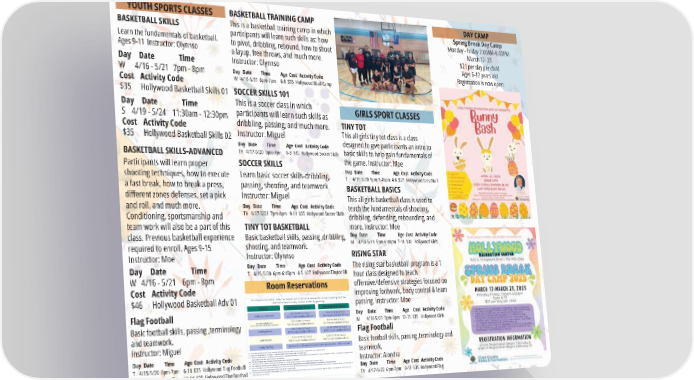 Spring Break Day Camp Monday - Friday 7:00AM-6:00PM March 17- 21 $21 per day per child Ages 6-12 years old Registration is now open. GIRLS SPORT CLASSES Day Date Time Age Cost Activity Code T 4/15-5/20 5pm-5:45pm 4-6 $27 Hollywood Girls Bball BASKETBALL BASICS This all girls basketball class is used to teach the fundamentals of shooting, dribbling, defending, rebounding, and more. Instructor: Moe RISING STAR The rising star basketball program is a 1 hour class designed to teach offensive/defensive strategies focused on improving footwork, body control & team passing. Instructor: Moe Day Date Time Age Cost Activity Code W 4/16-5/21 5pm-6pm 12-15 $35 Hollywood Girls TINY TOT This all girls tiny tot class is a class designed to give participants an intro to basic skills to help gain fundamentals of the game. Instructor: Moe Day Date Time Age Cost Activity Code M 4/14-5/19 5pm-6:00pm 7-11 $30 Hollywood Girls Room Reservations YOUTH SPORTS CLASSES BASKETBALL SKILLS Learn the fundamentals of basketball. Ages 9-11 Instructor: Olynnso Day Date Time W 4/16 - 5/21 7pm - 8pm Cost Activity Code $35 Hollywood Basketball Skills 01 BASKETBALL SKILLS-ADVANCED Participants will learn proper shooting techniques, how to execute a fast break, how to break a press, different zones defenses, set a pick and roll, and much more. Conditioning, sportsmanship and team work will also be a part of this class. Previous basketball experience required to enroll. Ages 9-15 Instructor: Moe Day Date Time W 4/16 - 5/21 6pm - 8pm Cost Activity Code $46 Hollywood Basketball Adv 01 BASKETBALL TRAINING CAMP This is a basketball training camp in which participants will learn such skills as: how to pivot, dribbling, rebound, how to shoot a layup, free throws, and much more. Instructor: Olynnso Day Date Time Age Cost Activity Code W 4/16-5/21 6pm-7pm 6-8 $35 Hollywood Bball Camp TINY TOT BASKETBALL Basic basketball skills, passing ,dribbling, shooting, and teamwork. Instructor: Olynnso DAY CAMP This is a soccer class in which participants will learn such skills as dribbling, passing, and much more. Instructor: Miguel Day Date Time S 4/19 - 5/24 11:30am - 12:30pm Cost Activity Code $35 Hollywood Basketball Skills 02 SOCCER SKILLS 101 Day Date Time Age Cost Activity Code TH 4/17-5/20 6pm-7pm 6-8 $35 Hollywood Soccer Skills SOCCER SKILLS Learn basic soccer skills-dribbling, passing, shooting, and teamwork. Instructor: Miguel Day Date Time Age Cost Activity Code TH 4/17-5/22 7pm-8pm 9-11 $35 Hollywood Soccer Skills Day Date Time Age Cost Activity Code T 4/15-5/20 6pm-6:45pm 4-5 $27 Hollywood Tinytot BB The Hollywood Recreation Center has several rooms that can be reserved for business meetings, birthday celebrations, bridal or baby showers and family gatherings. All Hollywood Recreation Center classes and facility activities take first priority. Room reservations are not guaranteed. Food and beverages are permitted. This facility does have a oven range and refrigerator. Tables and chairs will be provided at user’s request. Hollywood Recreation Center staff will not assist with the set up of tables or chairs. No other equipment (trash bags, stereos, extension cords, etc) will be provided. The sales of goods, merchandise or services are not permitted on premises. Smoking and consumption of alcoholic beverages are not permitted anywhere within Hollywood Recreation Center. The playing of loud music or the creation of any other disturbing noises will not be permitted anywhere in Hollywood Recreation Center. Setup and cleanup are the responsibility of the renter and should be conducted during the reservation times the renter request. Additional fees will be assessed if rooms are not cleaned, organized and returned to their proper order. A refundable cleaning deposit of $100.00 may be required for certain types of rentals. Clark County reserves the right to bill for any damages or excess cleaning required due to renter use. Room Community Rate Commercial Rate Multipurpose Room Warming Kitchen $80 for first 2 hours $20 for each additional hour Minimum of 2 staff required if outside normal operating hours at $30 each hour Used in conjunction with Multipurpose Room $160 for first 2 hours $40 for each additional hour $40 for first 2 hours $20 for each additional hour $80 for first 2 hours $40 for each additional hour Meeting Room Facility Staffing $60 for first 2 hours $20 for each additional hour $120 for first 2 hours $40 for each additional hour Gymnasium $100 for first 2 hours $40 for each additional hour $200 for first 2 hours $80 for each additional hour Room Reservations Flag Football Basic football skills, passing ,terminology and teamwork. Instructor: Miguel Day Date Time Age Cost Activity Code T 4/15-5/20 6pm-7pm 6-10 $35 Hollywood Flag Football W 4/16-5/21 6pm-7pm 11-14 $35 Hollywood Flag Football Flag Football Basic football skills, passing ,terminology and teamwork. Instructor: Alondra Day Date Time Age Cost Activity Code Th 4/17-5/22 6pm-7pm 8-11 $35 Hollywood Flag BASKETBALL SKILLS Learn the fundamentals of basketball. Ages 9-11 Instructor: Olynnso Day Date Time W 4/16 - 5/21 7pm - 8pm Cost Activity Code $35 Hollywood Basketball Skills 01 BASKETBALL SKILLS-ADVANCED Participants will learn proper shooting techniques, how to execute a fast break, how to break a press, a fast break, how to break a press, different zones defenses, set a pick different zones defenses, set a pick and roll, and much more. and roll, and much more. Conditioning, sportsmanship and Conditioning, sportsmanship and team work will also be a part of this team work will also be a part of this class. Previous basketball experience class. Previous basketball experience required to enroll. Ages 9-15 Instructor: Moe Day Date Time W 4/16 - 5/21 6pm - 8pm Cost Activity Code $46 Hollywood Basketball Adv 01 Day Date Time S 4/19 - 5/24 11:30am - 12:30pm Cost Activity Code Hollywood Basketball Skills 02 Flag Football Basic football skills, passing ,terminology and teamw