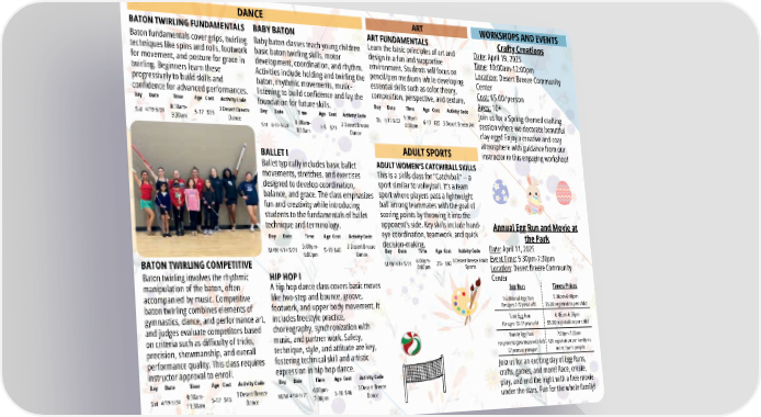 ADULT SPORTS Day Date Time Age Cost Activity Code Sat 4/19-5/24 8:30am- 9:30am 5-17 $35 3 Desert Breeze Dance Day Date Time Age Cost Activity Code Sat 4/19-5/24 9:30am- 11:30am 5-17 $46 3 Desert Breeze Dance *Instructor Approval Required Day Date Time Age Cost Activity Code Sat 4/19-5/24 8:00am- 8:30am 3-5 $23 3 Desert Breeze Dance Day Date Time Age Cost Activity Code M/W 4/14-5/21 6:00pm- 7:00pm 5-10 $46 3 Desert Breeze Dance Day Date Time Age Cost Activity Code M/W 4/14-5/21 6:00pm- 8:00pm 25+ $92 3 Desert Breeze Adult Sports Day Date Time Age Cost Activity Code M/W 4/14-5/21 5:00pm- 6:00pm 5-10 $46 3 Desert Breeze Dance ART Day Date Time Age Cost Activity Code Th 4/17-5/22 5:30pm- 6:30pm 6-17 $35 3 Desert Breeze Art Annual Egg Run and Movie at the Park Date: April 11, 2025 Event Time: 5:30pm-7:30pm Location: Desert Breeze Community Center Join us for an exciting day of Egg Runs, crafts, games, and more! Race, create, play, and end the night with a free movie under the stars. Fun for the whole family! Egg Run Times/Prices Traditional Egg Run For ages 3-12 years old 5:30pm-6:40pm $5.00 registration per child Teen Egg Run For ages 13-17 years old 6:45pm-6:55pm $5.00 registration per child Family Egg Run For parents/guardians with kids 12 years or younger 7:00pm-7:25pm $20 registration per family no more than 5 people DANCE BATON TWIRLING FUNDAMENTALS Baton fundamentals cover grips, twirling techniques like spins and rolls, footwork for movement, and posture for grace in twirling. Beginners learn these progressively to build skills and confidence for advanced performances. Baton twirling involves the rhythmic manipulation of the baton, often accompanied by music. Competitive baton twirling combines elements of gymnastics, dance, and performance art, and judges evaluate competitors based on criteria such as difficulty of tricks, precision, showmanship, and overall performance quality. This class requires instructor approval to enroll. BABY BATON Baby baton classes teach young children basic baton twirling skills, motor development, coordination, and rhythm. Activities include holding and twirling the baton, rhythmic movements, music- listening to build confidence and lay the foundation for future skills. HIP HOP I A hip hop dance class covers basic moves like two-step and bounce, groove, footwork, and upper body movement. It includes freestyle practice, choreography, synchronization with music, and partner work. Safety, technique, style, and attitude are key, fostering technical skill and artistic expression in hip hop dance. ADULT WOMEN’S CATCHIBALL SKILLS This is a skills class for “Catchiball” -- a sport similar to volleyball. It‘s a team sport where players pass a lightweight ball among teammates with the goal of scoring points by throwing it into the opponent's side. Key skills include hand- eye coordination, teamwork, and quick decision-making. BATON TWIRLING COMPETITIVE WORKSHOPS AND EVENTS BALLET I Ballet typically includes basic ballet movements, stretches, and exercises designed to develop coordination, balance, and grace. The class emphasizes fun and creativity while introducing students to the fundamentals of ballet technique and terminology. ART FUNDAMENTALS Learn the basic principles of art and design in a fun and supportive environment. Students will focus on pencil/pen mediums while developing essential skills such as color theory, composition, perspective, and texture. Crafty Creations Date: April 19, 2025 Time: 10:00am-12:00pm Location: Desert Breeze Community Center Cost: $5.00/person Ages: 10+ Join us for a Spring-themed crafting session where we decorate beautiful clay eggs! Enjoy a creative and cozy atmosphere with guidance from our instructor in this engaging workshop! Day Date Time Age Cost Activity Code Sat 4/19-5/24 8:30am- 9:30am 5-17 $35 3 Desert Breeze Dance Day Date Time Age Cost Activity Code Sat 4/19-5/24 9:30am- 11:30am 5-17 $46 3 Desert Breeze Dance *Instructor Approval Required Day Date Time Age Cost Activity Code Activity Code M/W 4/14-5/21 6:00pm- 7:00pm 5-10 $46 3 Desert Breeze 3 Desert Breeze Dance BATON TWIRLING FUNDAMENTALS Baton fundamentals cover grips, twirling techniques like spins and rolls, footwork for movement, and posture for grace in twirling. Beginners learn these progressively to build skills and confidence for advanced performances. Baton twirling involves the rhythmic manipulation of the baton, often accompanied by music. Competitive baton twirling combines elements of gymnastics, dance, and performance art, and judges evaluate competitors based on criteria such as difficulty of tricks, precision, showmanship, and overall performance quality. This class requires instructor approval to enroll. fostering technical skill and artistic fostering technical skill and artistic expression in hip hop dance. BATON TWIRLING COMPETITIVE DANCE Time Age Cost Activity Code 4/14-5/21 6:00pm- 8:00pm 25+ $92 3 Desert Breeze Adult Sports Time Age Cost Activity Code Activity Code 4/17-5/22 5:30pm- 6:30pm 6-17 $35 3 Desert Breeze Art 3 Desert Breeze Art Annual Egg Run and Movie at Annual Egg Run and Movie at Annual Egg Run and Movie at the Park Date: April 11, 2025 Event Time: 5:30pm-7:30pm Location: Desert Breeze Community Center Egg Run Egg Run Times/Prices Traditional Egg Run For ages 3-12 years old 5:30pm-6:40pm $5.00 registration per child Teen Egg Run For ages 13-17 years old 6:45pm-6:55pm $5.00 registration per child Family Egg Run For parents/guardians with kids 12 years or younger 7:00pm-7:25pm $20 registration per family no more than 5 people ADULT WOMEN’S CATCHIBALL SKILLS This is a skills class for “Catchiball” -- a sport similar to volleyball. It‘s a team sport where players pass a lightweight ball among teammates with the goal of scoring points by throwing it into the opponent's side. Key skills include hand- eye coordination, teamwork, and quick decision-making. Time decision-making. Time ART FUNDAMENTALS ART FUNDAMENTALS Lear