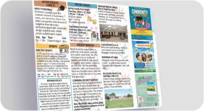 Saturday, March 22, 2025 8:00 am - 12:00 pm $10.00 per space No illegal substance sales Two spaces max. limited ACTIVE ADULTS CONT’D FACILITY RENTALS Thursday, March 27, 2025 5:30 pm - 7:00 pm $5.00 per person Ages: 5 and up All supplies provided SPECIAL EVENTS Community Yard Sale Day Date Time Age Cost Activity Code WED 2/26-5/12 5pm-5:45pm 3-5 $15 1 Melvin EnnisTotSpt ADULT PICKLEBALL Pickleball is a paddle sport that combines elements of badminton, tennis, and table tennis. Two or four players use paddles made of wood or composite materials to hit a perforated polymer ball. Suitable for all ages and skills level. Paddle rentals available upon request. Day Age Time Cost M - F 18+ 7:30am-6:00pm Free Melvin Ennis Recreation Center is perfect for small parties, meetings, and outdoor sports fields. We offer rental spaces in our facility and outdoor park fields for your special occasion or sports events. Contact us at (702) 455-1291 for availability, rental fees, rules, and request forms. Rates vary by room request, date and hours of rental. Rentals are first come, first serve basis. WARMING KITCHEN Should be rented in conjunction with a room. No grills or stove top use. Equipped with refrigerator, oven, and sink. INDOOR RENTAL AREAS MULTI-PURPOSE AREA Perfect for parties (i.e. baby showers, anniversaries, birthdays, graduation, meetings, etc.) Food allowed, but no alcoholic beverages or smoking permitted. CLASSROOM(S) A or B Perfect for small meetings, HOA’S, etc. Food allowed, but no alcoholic beverages or smoking permitted. CLEANING/SECURITY DEPOSIT A security/cleaning deposit of $100 is due day of event prior to entering room. Deposit is only accepted in form of check or money order. The amount will be refunded if the premises are left clean and undamaged and the renter met all center guidelines. OUTDOOR FIELDS (1-4) SOFTBALL FIELD (5) Perfect for team practices, games, etc. We have 5 fields with lights outdoors. Rates begin at $12/per hour. $10 light permit, 2 hour minimum. SPORTS TINY TOT SPORTS Tiny Tot Sports is a class that introduces children to sports and group games, and helps them develop motor skills and social and emotional skills. The class is designed for children ages 3–5.5 years old and may include activities such as: basketball, floor hockey, soccer, kickball, and t-ball. Parents must remain present during class. REFUND POLICY If a class or program is cancelled by the department, a full refund will be given. Class registration may be cancelled by an individual and issued a 100% refund if cancellation is made prior to the first class. No refunds will be issued after the first day of class. Credits issued to household account expire after 90 days. At Melvin Ennis Recreation Center staff makes every effort to make sure programs and information meet deadlines. We apologize in advance should you find an error and will correct it promptly. Note: We DO NOT allow confetti, glitter, smoke/fog machines, propane, or use of alcohol in our facility. Spring Family Paint Night Day Date Time Age Cost Activity Code WED 2/26-5/12 5pm-5:45pm 3-5 $15 1 Melvin EnnisTotSpt ADULT PICKLEBALL Pickleball is a paddle sport that combines elements of badminton, tennis, and table tennis. Two or four players use paddles made of wood or composite materials to hit a perforated polymer ball. Suitable for all ages and skills level. Paddle rentals available upon request. Day Age Time Cost 7:30am-6:00pm Free left clean and undamaged and the left clean and undamaged and the renter met all center guidelines. renter met all center guidelines. TINY TOT SPORTS Tiny Tot Sports is a class that introduces Tiny Tot Sports is a class that introduces Tiny Tot Sports is a class that introduces children to sports and group games, and children to sports and group games, and helps them develop motor skills and social helps them develop motor skills and social and emotional skills. The class is designed for and emotional skills. The class is designed for children ages 3–5.5 years old and may children ages 3–5.5 years old and may include activities such as: basketball, floor include activities such as: basketball, floor hockey, soccer, kickball, and t-ball. Parents hockey, soccer, kickball, and t-ball. Parents must remain present during class. Note: We DO NOT allow confetti, glitter, Note: We DO NOT allow confetti, glitter, smoke/fog machines, propane, or use of smoke/fog machines, propane, or use of alcohol in our facility. ACTIVE ADULTS CONT’D Day Age Time M - F M - F M - F 18+ 7:30am-6:00pm TINY TOT SPORTS TINY TOT SPORTS TINY TOT SPORTS TINY TOT SPORTS Tiny Tot Sports is a class that introduces Tiny Tot Sports is a class that introduces Tiny Tot Sports is a class that introduces Tiny Tot Sports is a class that introduces children to sports and group games, and children to sports and group games, and helps them develop motor skills and social helps them develop motor skills and social and emotional skills. The class is designed for and emotional skills. The class is designed for children ages 3–5.5 years old and may children ages 3–5.5 years old and may include activities such as: basketball, floor include activities such as: basketball, floor hockey, soccer, kickball, and t-ball. Parents hockey, soccer, kickball, and t-ball. Parents must remain present during class. Tiny Tot Sports is a class that introduces SPORTS SPORTS REFUND POLICY If a class or program is cancelled by the department, a full refund will be given. Class registration may be cancelled by an individual and issued a 100% refund if cancellation is made prior to the first class. No refunds will be issued after the first day of class. Credits issued to household account expire after 90 days. At Melvin Ennis Recreation Center staff makes every effort to make sure programs and information meet deadlines. We apologize in advance should you find an error and will correct it promptly. WARMING KITCHEN Should be rented in conjunction with No grills
