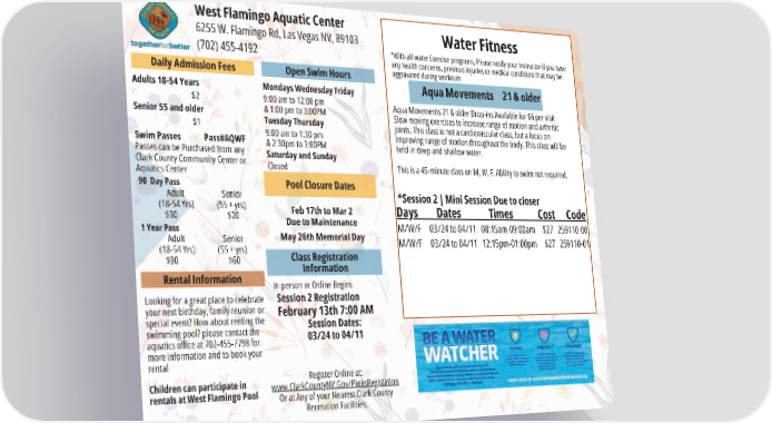 Daily Admission Fees Open Swim Hours 6255 W. Flamingo Rd, Las Vegas NV, 89103 (702) 455-4192 West Flamingo Aquatic Center Adults 18-54 Years $2 Rental Information Senior 55 and older $1 Swim Passes Pass#AQWF Passes can be Purchased from any Clark County Community Center or Aquatics Center 90 Day Pass Adult Senior (18-54 Yrs) (55 + yrs) $30 $20 Adult Senior (18-54 Yrs) (55 + yrs) $90 $60 1 Year Pass Children can participate in rentals at West Flamingo Pool Looking for a great place to celebrate your next birthday, family reunion or special event? How about renting the swimming pool? please contact the aquatics office at 702-455-7798 for more information and to book your rental Mondays Wednesday Friday Tuesday Thursday Saturday and Sunday 9:00 am to 12:00 pm & 1:00 pm to 3:00PM 9:00 am to 1:30 pm & 2:30pm to 3:00PM Closed Pool Closure Dates Feb 17th to Mar 2 Due to Maintenance May 26th Memorial Day Class Registration Information In person or Online Begins Session 2 Registration February 13th 7:00 AM Session Dates: 03/24 to 04/11 Register Online at: www.ClarkCountyNV.Gov/ParksRegistation Or at Any of your Nearest Clark County Recreation Facilities. Water Fitness *With all water Exercise programs, Please notify your instructor if you have any health concerns, previous injuries or medical conditions that may be aggravated during workouts Aqua Movements 21 & older Aqua Movements 21 & older Drop-ins Available for $6 per visit Slow moving exercises to increase range of motion and arthritic joints. This class is not a cardiovascular class, but a focus on improving range of motion throughout the body. This class will be held in deep and shallow water. This is a 45-minute class on M, W, F. Ability to swim not required. *Session 2 | Mini Session Due to closer Days Dates Times Cost Code M/W/F 03/24 to 04/11 08:15am-09:00am $27 259110-00 M/W/F 03/24 to 04/11 12:15pm-01:00pm $27 259110-01 6255 W. Flamingo Rd, Las Vegas NV, 89103 (702) 455-4192 West Flamingo Aquatic Center Adults 18-54 Years $2 Senior 55 and older $1 Swim Passes Pass#AQWF Passes can be Purchased from any Clark County Community Center or Senior (18-54 Yrs) (18-54 Yrs) (55 + yrs) $20 Senior Senior (18-54 Yrs) (55 + yrs) (55 + yrs) $60 Children can participate in rentals at West Flamingo Pool Looking for a great place to celebrate your next birthday, family reunion or special event? How about renting the swimming pool? please contact the aquatics office at 702-455-7798 for more information and to book your rental Register Online at: Register Online at: www.ClarkCountyNV.Gov/ParksRegistation www.ClarkCountyNV.Gov/ParksRegistation www.ClarkCountyNV.Gov/ParksRegistation Or at Any of your Nearest Clark County Or at Any of your Nearest Clark County Recreation Facilities. Daily Admission Fees Passes can be Purchased from any Passes can be Purchased from any Passes can be Purchased from any Clark County Community Center or Clark County Community Center or Clark County Community Center or Aquatics Center Aquatics Center Aquatics Center Aquatics Center 90 Day Pass Day Pass Day Pass Day Pass Adult Adult Adult Adult (18-54 Yrs) (18-54 Yrs) (18-54 Yrs) (18-54 Yrs) $30 Adult (18-54 Yrs) $90 1 Year Pass 1 Year Pass Rental Information 6255 W. Flamingo Rd, Las Vegas NV, 89103 (702) 455-4192 West Flamingo Aquatic Center Mondays Wednesday Friday Tuesday Thursday Saturday and Sunday 9:00 am to 12:00 pm & 1:00 pm to 3:00PM 9:00 am to 1:30 pm & 2:30pm to 3:00PM Closed Feb 17th to Mar 2 Due to Maintenance May 26th Memorial Day In person or Online Begins In person or Online Begins Session 2 Registration Session 2 Registration February 13th February 13th 7:00 AM Session Session Dates: 03/24 to 04/11 03/24 to 04/11 Open Swim Hours Pool Closure Dates Class Registration Information Class Registration Information Class Registration Water Fitness *With all water Exercise programs, Please notify your instructor if you have any health concerns, previous injuries or medical conditions that may be aggravated during workouts Aqua Movements 21 & older Drop-ins Available for $6 per visit Slow moving exercises to increase range of motion and arthritic joints. This class is not a cardiovascular class, but a focus on improving range of motion throughout the body. This class will be held in deep and shallow water. This is a 45-minute class on M, W, F. Ability to swim not required. *Session 2 | Mini Session Due to closer Days Days Dates Times Cost Code M/W/F 03/24 to 04/11 08:15am-09:00am $27 259110-00 M/W/F 03/24 to 04/11 12:15pm-01:00pm $27 259110-01 *With all water Exercise programs, Please notify your instructor if you have any health concerns, previous injuries or medical conditions that may be aggravated during workouts Aqua Movements 21 & older Drop-ins Available for $6 per visit Slow moving exercises to increase range of motion and arthritic joints. This class is not a cardiovascular class, but a focus on improving range of motion throughout the body. This class will be held in deep and shallow water. This is a 45-minute class on M, W, F. Ability to swim not required. *Session 2 | Mini Session Due to closer Days Days M/W/F M/W/F Water Fitness *With all water Exercise programs, Please notify your instructor if you have any health concerns, previous injuries or medical conditions that may be Aqua Movements 21 & older Drop-ins Available for $6 per visit Slow moving exercises to increase range of motion and arthritic joints. This class is not a cardiovascular class, but a focus on Aqua Movements 21 & older 21 & older