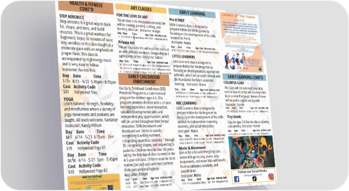 EARLY LEARNING Little Learners class is designed to prepare kiddos for Kindergarten by focusing on the development of the skills needed for independent reasoning, manners, and social interaction. Instructor: Maria If you have the heart of a public servant and the spirit of an entrepreneur, we are looking for you! We’re looking for highly motivated professional to fill the positions of instructors who possess skills and talents they wish to share with the public to run specialty classes and programs for adults and youth in our community. We would love to add on to our existing programs. $15 per hour, depending on experience Candidates must be 18 years of age. High school diploma or equivalent is a must. Scan here to apply! We're Hiring! CLASS INSTRUCTOR Follow our Social Media @HollywoodRecCenter Day Date Time Age Cost Activity Code T/TH 4/15-5/22 9:30am-10:15am 3-5 $35 Hollywood TH HEALTH & FITNESS CONT’D ART CLASSES STEP AEROBICS Step aerobics is a great way to burn fat, shape, and tone, and build muscles. This is a great workout for beginners. Enjoy 30 minutes of basic step aerobics in this class taught at a moderate pace with an emphasis on proper form. This class is accompanied by highenergy music and is very easy to follow. Instructor: Aurora/Kris Day Date Time T/Th 4/15 - 5/22 5:45pm - 6:15pm Cost Activity Code $41 Hollywood Step YOGA Learn balance, strength, flexibility, and mindfulness where a variety of yoga movements and postures are taught. All levels welcome. Namaste! Instructor: Kandy/Allison Day Date Time M/F 4/14 - 5/23 6:15am - 7am Cost Activity Code $19 Hollywood Yoga 01 Day Date Time M/W 4/14 - 5/21 5pm - 5:45pm Cost Activity Code $19 Hollywood Yoga 02 FOR THE LOVE OF ART This art class is for the passionate artist. We will be creating, painting, crafting, and learning about art. Instructor: Bridget Day Date Time Age Cost Activity Code T 4/15-5/20 5:30pm-6:30pm 8-12 $35 Hollywood Art 01 Pre-K PREP Little Learners class is designed to prepare kiddos for Kindergarten by focusing on the development of the skills needed for Pre-K. Instructor: Maria Day Date Time Age Cost Activity Code M/W 4/14-5/21 5pm-5:45pm 3-5 $41 Hollywood Pre-k Prep LITTLE LEARNERS Little Learners class is designed to prepare kiddos for Kindergarten by focusing on developmentally appropriate activities, which will provide children with the foundation for future academic learning. Instructor: Maria Day Date Time Age Cost Activity Code M/W 4/14-5/21 8am-8:45am 3-5 $41 Hollywood LL M/W 4/14-5/21 9am-9:45am 3-5 $41 Hollywood LL ABC LEARNING Day Date Time Age Cost Activity Code M/W 4/14-5/21 10am-10:45am 3-4 $41 Hollywood ABC M/W 4/14-5/21 11am-11:45am 3-4 $41 Hollywood ABC Music & Movement Join us for a fun and energizing class where kids get to sing, dance, play instruments, and more! Kids will benefit from socialization, creativity, and coordination. Instructor: Maria Day Date Time Age Cost Activity Code T/TH 4/15-5/22 6pm-6:45pm 3-5 $41 Hollywood S & S EARLY CHILDHOOD ENRICHMENT Our Early Childhood Enrichment (ECE) Preschool Program is a state-licensed program for children ages 4-5. This program provides children with a creative learning experience, social interaction, valuable developmental skills and independent play opportunities, which will be carried throughout their formal education. Skills introduced and developed are: letters & sounds, recognizing & writing numbers, recognizing quantities, counting 1 through 20, recognizing shapes, and sequencing & patterns. Children must be four (4) years old by the first day of class to enroll in the 4-5-year old class. Children must be toilet trained (no pull-ups) and must perform their own personal hygiene. Instructor: Bridget Day Date Time Age Cost Activity Code M/W 3/3 9am-12pm 4-5 $200 Hollywood ECE T/TH 3/4 9am-12pm 4-5 $200 Hollywood ECE COLORFUL CUBS This Class will not only teach your little one the love of art but will also help them learn a second language. Names of items will be said in English and Spanish. Instructor: Yasmin Day Date Time Age Cost Activity Code T/TH 4/15-5/22 10:45am-11:30am 4-7 $35 Hollywood CC Private Art This art class is for the will teach the basics of art with different mediums. Designed to be 2 participants or less Instructor: Sabine Day Date Time Age Cost Activity Code M 4/14-5/19 4:00pm-5:00pm 8-13 $35 Hollywood Art 02 Th 4/17-5/22 4:00pm-5:00pm 8-13 $35 Hollywood Art 03 F 4/18-5/23 4:00pm-5:00pm 8-13 $35 Hollywood Art 04 EARLY LEARNING CONT’D Tiny Hands Class for ages 3-5 that introduces drawing and painting. Instructor: Yasmin STEP AEROBICS Step aerobics is a great way to burn fat, shape, and tone, and build muscles. This is a great workout for beginners. Enjoy 30 minutes of basic step aerobics in this class taught at a moderate pace with an emphasis on proper form. This class is accompanied by highenergy music and is very easy to follow. Instructor: Aurora/Kris Time 4/15 - 5/22 5:45pm - 6:15pm Activity Code Hollywood Step Hollywood Step Learn balance, strength, flexibility, Learn balance, strength, flexibility, and mindfulness where a variety of and mindfulness where a variety of yoga movements and postures are yoga movements and postures are taught. All levels welcome. Namaste! taught. All levels welcome. Namaste! Instructor: Kandy/Allison Day Date Time M/F 4/14 - 5/23 6:15am - 7am Cost Activity Code $19 Hollywood Yoga 01 Day Date Time M/W 4/14 - 5/21 5pm - 5:45pm Cost Activity Code $19 Hollywood Yoga 02 instruments, and more! Kids will benefit from socialization, creativity, and coordination. Instructor: Maria Day Date T/TH 4/15-5/22 6pm-6:45pm Our Early Childhood Enrichment (ECE) Preschool Program is a state-licensed program for children ages 4-5. This program provides children with a creative learning experience, social interaction, valuable developmental skills and independent play opportunities, which will be carried throughout their formal education. Skills introduced and developed are: letters & sounds, d