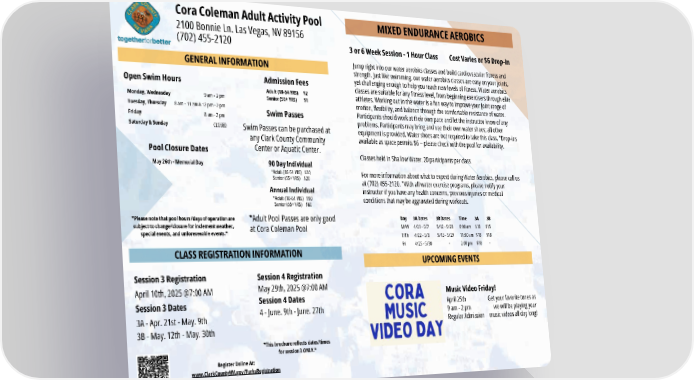 GENERAL INFORMATION CLASS REGISTRATION INFORMATION MIXED ENDURANCE AEROBICS UPCOMING EVENTS Day 3A Dates 3B Dates Time 3A 3B M/W 4/21 - 5/7 5/12 - 5/28 8:00 am $18 $15 T/Th 4/22 - 5/8 5/13 - 5/29 11:00 am $18 $18 Fri 4/25 - 5/30 - 2:00 pm $18 - Session 3 Registration April 10th, 2025 @7:00 AM 3A - Apr. 21st - May. 9th 3B - May. 12th - May. 30th Session 3 Dates *This brochure reflects dates/times for session 3 ONLY.* Jump right into our water aerobics classes and build cardiovascular fitness and strength. Just like swimming, our water aerobics classes are easy on your joints, yet challenging enough to help you reach new levels of fitness. Water aerobics classes are suitable for any fitness level, from beginning exercisers through elite athletes. Working out in the water is a fun way to improve your joint range of motion, flexibility, and balance through the comfortable resistance of water. Participants should work at their own pace and let the instructor know of any problems. Participants may bring and use their own water shoes; all other equipment is provided. Water shoes are not required to take this class. *Drop-ins available as space permits $6 – please check with the pool for availability. Classes held in Shallow Water. 20 participants per class. For more information about what to expect during Water Aerobics, please call us at (702) 455-2120. *With all water exercise programs, please notify your instructor if you have any health concerns, previous injuries or medical conditions that may be aggravated during workouts. Register Online At: www.ClarkCountyNV.gov/ParksRegistration 2100 Bonnie Ln. Las Vegas, NV 89156 (702) 455-2120 Cora Coleman Adult Activity Pool Pool Closure Dates Open Swim Hours Monday, Wednesday 9 am - 2 pm Tuesday, Thursday 8 am - 11 am & 12 pm - 2 pm Friday 8 am - 2 pm Saturday & Sunday CLOSED *Please note that pool hours/days of operation are subject to change/closure for inclement weather, special events, and unforeseeable events.* May 26th - Memorial Day Swim Passes Adult (18-54 YRS) $2 Senior (55+ YRS) $1 Swim Passes can be purchased at any Clark County Community Center or Aquatic Center. 90 Day Individual *Adult (18-54 YRS) $30 Senior (55+ YRS) $20 Annual Individual *Adult (18-54 YRS) $90 Senior (55+ YRS) $60 Admission Fees *Adult Pool Passes are only good at Cora Coleman Pool Session 4 Registration May 29th, 2025 @7:00 AM 4 - June. 9th - June. 27th Session 4 Dates Cost Varies or $6 Drop-In 3 or 6 Week Session - 1 Hour Class Music Video Friday! April 25th 9 am - 2 pm Regular Admission Get your favorite tunes as we will be playing your music videos all day long!