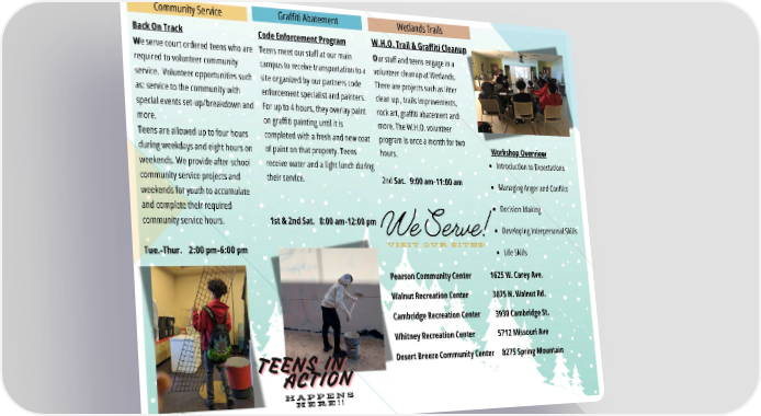 Community Service Graffiti Abatement Back On Track W e serve court ordered teens who are required to volunteer community service. Volunteer opportunities such as: service to the community with special events set-up/breakdown and more. T eens are allowed up to four hours during weekdays and eight hours on weekends. We provide after-school community service projects and weekends for youth to accumulate and complete their required community service hours. Tue.-Thur. 2:00 pm-6:00 pm Code Enforcement Program T eens meet our staff at our main campus to receive transportation to a site organized by our partners code enforcement specialist and painters. For up to 4 hours, they overlay paint on graffiti painting until it is completed with a fresh and new coat of paint on that property. T eens receive water and a light lunch during their service. 1st & 2nd Sat. 8:00 am-12:00 pm Wetlands Trails O ur staff and teens engage in a volunteer cleanup at Wetlands. There are projects such as litter clean up , trails improvements, rock art, graffiti abatement and more. The W.H.O. volunteer program is once a month for two hours. 2nd Sat. 9:00 am-11:00 am Workshop Overview Introduction to Expectations Managing Anger and Conflict Decision Making Developing Interpersonal Skills Life Skills W.H.O. Trail & Graffiti Cleanup TEENS IN TEENS IN TEENS IN ACTION ACTION ACTION H A P P E N S H E R E ! ! We Serve! V i s i t O u r S i t e s : Pearson Community Center 1625 W. Carey Ave. Walnut Recreation Center 3075 N. Walnut Rd. Cambridge Recreation Center 3930 Cambridge St. Whitney Recreation Center 5712 Missouri Ave Desert Breeze Community Center 8275 Spring Mountain