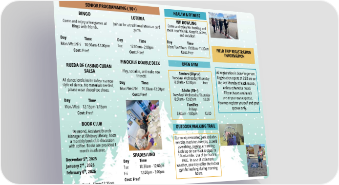 Day Time Mon/Tue/Thurs 10:00am-11:30am Cost: Free OUTDOOR WALKING TRAIL HEALTH & FITNESS Come and enjoy a few games of Bingo with friends. Day Time Mon/Wed/Fri 10:30am-12:00pm Cost: Free! PINOCHLE DOUBLE DECK Play, socialize, and make new friends! Our newly renovated park includes exercise machines to enjoy as well as walking, jogging, or running. Each lap on our track is equal to 1/4 of a mile. Use of the track is FREE. In case of inclement weather, you may utilize the indoor gym for walking during morning hours. All registration is done in-person. Registration opens at 8:00 am on the last Monday of each month, unless otherwise noted. All purchases and meals are at your own expense. You may register yourself and your spouse only. Desmond, Assistant Branch Manager at Whitney Library, hosts a monthly book club discussion with coffee. Books are provided 1 month in advance. WII BOWLING Come and enjoy Wii bowling and meet new friends. Keep fit, active, and socialize! Day Time Mon/Wed/Fri 10:30am-12:00pm Cost: Free! SENIOR PROGRAMMING ( 50+) BINGO LOTERIA Join us for a traditional Mexican card game. Day Time Tue 12:00pm - 2:00pm Cost: Free! BOOK CLUB December 5 , 2025 th January 2 , 2026 nd February 6 , 2026 th Cost: Free! Time:12:15pm SPADES/UNO Day Time Tue 10:30am - 12:00pm Fri 12:00pm - 3:00pm Cost: Free! OPEN GYM Seniors (50yrs+) Tuesday/ Wednesday/Thursday 8:00am - 12:00pm Free Adults (18+ ) Tuesday/ Wednesday/Thursday 8:00am - 12:00pm $2.00 Families Fridays 8:00am - 1:00pm $2.00 RUEDA DE CASINO CUBAN SALSA All dance levels invite to learn a new style of dance. No materials needed, please wear closed toe shoes. Day Time Mon/Wed 12:15pm-1:15pm Cost: Free! FIELD TRIP REGISTRATION INFORMATION