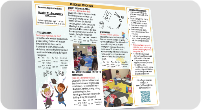 Online Registration can be found at: www.ClarkCountyNV.Gov/ ParksRegistration PRESCHOOL EDUCATION Educational Classes Notes: Parents must remain inside the facility at all times, outside of the classroom. TO LIMIT DISTRACTIONS FOR OUR STUDENTS, NO PARENTS ARE ALLOWED IN THE CLASSROOM. Classes start promptly at their respective start times. Participants must be able to remain in their seats and follow instruction. Please help us protect the privacy of our students by abiding to the rule of no photography during class. This is a year-long program with registration every 7 weeks (except summers). Beginning August 2025 through May 2026. If a student has 3 unexcused absences, they will be unenrolled and the waitlist will be called. To help with accounting for supplies, please notify the center if you will miss a class. It is highly encouraged to continue practicing with your child at home and completing the homework before the next due date. Education Registration Dates: October 13 - December 5 Fall Registration Online Registration: Sept. 11 at 7am In-Person Registration: Sept. 15 at 7am LITTLE LEARNERS This is not a mommy & me class! For toddlers who need an introduction to a social setting. Children will focus on how to follow directions and be introduced to colors, shapes, crafts, circle time, and more! Parents/guardians must remain in the building during the class period. ALL ABOUT LEARNING (INTRO TO PRESCHOOL) This is not a mommy & me class! Designed for children that have never been in a classroom setting (first time socialization). The children will learn their letters, numbers, tracing, cutting, and following directions. Parents/guardians must remain in the building during the class period. KINDER PREP This is not a mommy & me class! Designed for children that have already been in a classroom setting or are moving up from Bright Beginners. The children will learn skills to help them get ready for kindergarten. Counting and recognizing numbers up to 30, sight words, math concepts, writing, and following instructions will be taught. Parents/guardians must remain in the building during the class period. BRIGHT BEGINNERS PRE-K This is not a mommy & me class! Designed for children that have already been in a classroom setting or are moving up from Little Learners. The children will learn the alphabet, numbers, shapes, crafts, science, and following directions. Consistency is recommended for success in this class. Parents/guardians must remain in the building during the class period. Day Date Time Age Cost Activity Code TU/TH 10/14 - 12/4 10:00am- 11:00am 2-2.99 $54 7 Desert Breeze Education TU/TH 10/14 - 12/4 11:30am- 12:30pm 2-2.99 $54 7 Desert Breeze Education Day Date Time Age Cost Activity Code TU/TH 10/14 - 12/4 1:00pm- 2:30pm 3-3.99 $72 7 Desert Breeze Education Day Date Time Age Cost Activity Code M/W/F10/13 - 12/5 12:00pm- 1:30pm 4-5 $95 7 Desert Breeze Education Day Date Time Age Cost Activity Code M/W/F 10/13 - 12/5 10:00am- 11:30am 4-5 $95 7 Desert Breeze Education