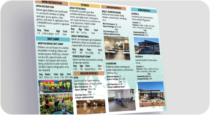 OPEN RECREATION DAY CAMP INDOOR RENTALS INDOOR RENTALS PARK RENTALS Day Age Time Cost M-F 18+ 7a-11a Free ADULT BASKETBALL FITNESS OPEN RECREATION School-aged children can participate in a variety of activities including: open gym, group games, video games, and more. A registration form is REQUIRED with a parent’s signature in person. Day Time Age Cost T-F 2:45-5:45pm 6-17 Free ADULT PICKLEBALL Pickleball is a paddle sport that combines elements of badminton, tennis, and table tennis. Participants are responsible for set up and clean up of all equipment. Paddle rentals available upon request. MULTI-PURPOSE ROOM CLASSROOM WINTER BREAK DAY CAMP Children can participate in a variety of activities including: indoor and outdoor games, field trips, themed arts & crafts, special events, and movies. Participants will need to bring a daily lunch and snack that DO NOT require refrigeration or to be reheated. Day Dates Time Age Cost M-F 12/22-1/2 7a-6p 6-12 $21 a day Adults can enjoy open gym basketball. Basketball rentals are available upon request with a form of identification. Day Age Time Cost M-F 18+ 11a-2:30p $2 GYM Can be used for larger meetings, basketball games, or larger parties. Max Participants: 200 Square Footage: 105ft x 75ft Cost First Two Hours: $160 $70 per additional hour Perfect for small parties (baby showers, anniversaries, meetings, etc.) Max Participants: 30 Square Footage: 36ft x 25ft Cost First Two Hours: $140 $50 per additional hour Perfect for smaller meetings and parties (baby showers, anniversaries, meetings, etc.) Max Participants: 30 Square Footage: 36ft x 25ft Cost First Two Hours: $140 $50 per additional hour GAZEBO A Located by Cora Coleman Senior Center and the Playground. Capacity: 105 Features: 9 tables, 3 grills, and 3 prep tables. Covered by a shade shelter. Cost Community Rate: $75 Commercial Rate: $150 GAZEBO B Located by Bob Price Recreation Center. Capacity: 70 Features: 6 tables, 2 grills, and 2 prep tables. Covered by a shade shelter. Cost Community Rate: $50 Commercial Rate: $100 FITNESS BOOTCAMP Adults can learn and practice a variety of exercise routines. Day Age Time Cost T-Th 18+ 8am-9:45am FREE