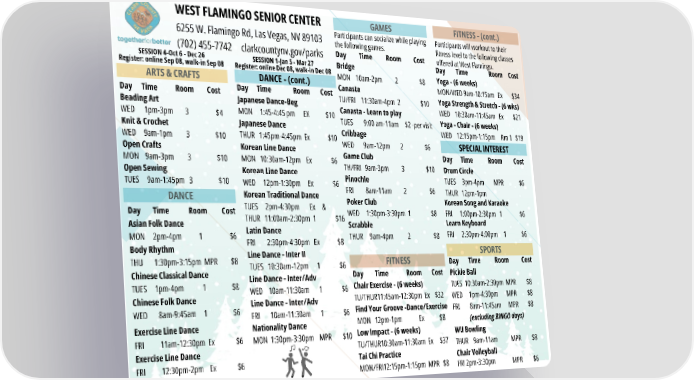 ARTS & CRAFTS GAMES DANCE FITNESS FITNESS - (cont.) SPORTS Day Time Room Cost Japanese Dance-Beg MON 1:45-4:45 pm EX $10 Japanese Dance THUR 1:45pm-4:45pm Ex $10 Korean Line Dance MON 10:30am-12pm Ex $6 Korean Line Dance WED 12pm-1:30pm Ex $6 Korean Traditional Dance TUES 2pm-4:30pm Ex & THUR 11:00am-2:30pm 1 $16 Latin Dance FRI 2:30pm-4:30pm Ex $8 Line Dance - Inter II TUES 10:30am-12pm 1 $6 Line Dance - Inter/Adv WED 10am-11:30am 1 $6 Line Dance - Inter/Adv FRI 10am-11:30am 1 $6 Nationality Dance MON 1:30pm-3:30pm MPR $10 Day Time Room Cost Asian Folk Dance MON 2pm-4pm 1 $6 Body Rhythm THU 1:30pm-3:15pm MPR $8 Chinese Classical Dance TUES 1pm-4pm 1 $8 Chinese Folk Dance WED 8am-9:45am 1 $6 Exercise Line Dance FRI 11am-12:30pm Ex $6 Exercise Line Dance FRI 12:30pm-2pm Ex $6 6255 W. Flamingo Rd, Las Vegas, NV 89103 (702) 455-7742 clarkcountynv.gov/parks WEST FLAMINGO SENIOR CENTER Participants will workout to their fitness level to the following classes offered at West Flamingo. Participants can socialize while playing the following games. Day Time Room Cost Beading Art WED 1pm-3pm 3 $4 Knit & Crochet WED 9am-1pm 3 $10 Open Crafts MON 9am-3pm 3 $10 Open Sewing TUES 9am-1:45pm 3 $10 DANCE - (cont.) Day Time Room Cost Chair Exercise - (6 weeks) TU/THUR11:45am-12:30pm Ex $32 Find Your Groove -Dance/Exercise MON 12pm-1pm Ex $8 Low Impact - (6 weeks) TU/THUR10:30am-11:30am Ex $37 Tai Chi Practice MON/FRI12:15pm-1:15pm MPR $8 Day Time Room Cost Bridge MON 10am-2pm 2 $8 Canasta TU/FRI 11:30am-4pm 2 $10 Canasta - Learn to play TUES 9:00 am-11am $2 -per visit Cribbage WED 9am-12pm 2 $6 Game Club TH/FRI 9am-3pm 3 $10 Pinochle FRI 8am-11am 2 $6 Poker Club WED 1:30pm-3:30pm 1 $8 Scrabble THUR 9am-4pm 2 $8 Day Time Room Cost Pickle Ball TUES 10:30am-2:30pm MPR $8 WED 1pm-4:30pm MPR $8 FRI 8am-11:45am MPR $8 (excluding BINGO days) WII Bowling THUR 9am-11am MPR $8 Chair Volleyball FRI 2pm-3:30pm MPR $6 SPECIAL INTEREST Day Time Room Cost Drum Circle TUES 3pm-4pm MPR $6 THUR 12pm-1pm Day Time Room Cost Yoga - (6 weeks) MON/WED 9am-10:15am Ex $34 Yoga Strength & Stretch - (6 wks) WED 10:30am-11:45am Ex $21 Yoga - Chair - (6 weeks) WED 12:15pm-1:15pm Rm 1 $19 Learn Keyboard FRI 2:30pm-4:00pm 1 $6 SESSION 1-Jan 5 - Mar 27 Register: online Dec 08, walk-in Dec 08 Korean Song and Karaoke FRI 1:00pm-2:30pm 1 $6 SESSION 4-Oct 6 - Dec 26 Register: online Sep 08, walk-in Sep 08