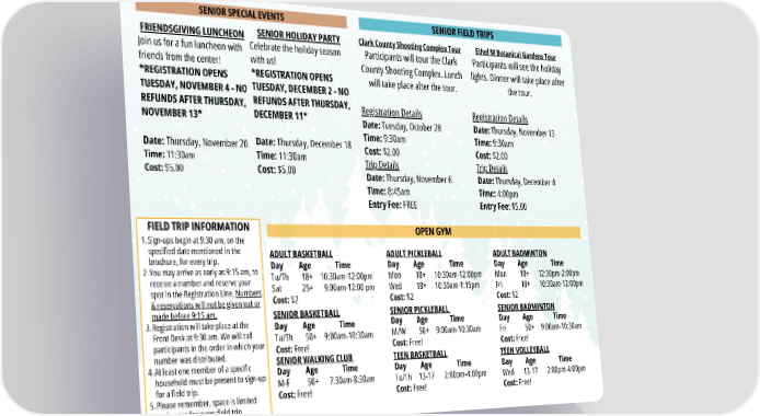 FIELD TRIP INFORMATION 1.Sign-ups begin at 9:30 am, on the specified date mentioned in the brochure, for every trip. 2.You may arrive as early as 9:15 am, to receive a number and reserve your spot in the Registration Line. Numbers & reservations will not be given out or made before 9:15 am. 3.Registration will take place at the Front Desk at 9:30 am. We will call participants in the order in which your number was distributed. 4.At least one member of a specific household must be present to sign-up for a field trip. 5.Please remember, space is limited and varies for every field trip. OPEN GYM SENIOR FIELD TRIPS ADULT BASKETBALL Day Age Time Tu/Th 18+ 10:30am-12:00pm Sat 25+ 9:00am-12:00 pm Cost: $2 TEEN BASKETBALL Day Age Time Tu/Th 13-17 2:00pm-4:00pm Cost: Free! TEEN VOLLEYBALL Day Age Time Wed 13-17 2:00pm-4:00pm Cost: Free! SENIOR BASKETBALL Day Age Time Tu/Th 50+ 9:00am-10:30am Cost: Free! ADULT PICKLEBALL Day Age Time Mon 18+ 10:30am-12:00pm Wed 18+ 10:30am-1:15pm Cost: $2 SENIOR PICKLEBALL Day Age Time M/W 50+ 9:00am-10:30am Cost: Free! ADULT BADMINTON Day Age Time Mon 18+ 12:30pm-2:00pm Fri 18+ 10:30am-12:00pm Cost: $2 SENIOR BADMINTON Day Age Time Fri 50+ 9:00am-10:30am Cost: Free! SENIOR WALKING CLUB Day Age Time M-F 50+ 7:30am-8:30am Cost: Free! SENIOR SPECIAL EVENTS SENIOR HOLIDAY PARTY Celebrate the holiday season with us! *REGISTRATION OPENS TUESDAY, DECEMBER 2 - NO REFUNDS AFTER THURSDAY, DECEMBER 11* Date: Thursday, December 18 Time: 11:30am Cost: $5.00 Clark County Shooting Complex Tour Participants will tour the Clark County Shooting Complex. Lunch will take place after the tour. Registration Details Date: Tuesday, October 28 Time: 9:30am Cost: $2.00 Trip Details Date: Thursday, November 6 Time: 8:45am Entry Fee: FREE FRIENDSGIVING LUNCHEON Join us for a fun luncheon with friends from the center! *REGISTRATION OPENS TUESDAY, NOVEMBER 4 - NO REFUNDS AFTER THURSDAY, NOVEMBER 13* Date: Thursday, November 20 Time: 11:30am Cost: $5.00 Ethel M Botanical Gardens Tour Participants will see the holiday lights. Dinner will take place after the tour. Registration Details Date: Thursday, November 13 Time: 9:30am Cost: $2.00 Trip Details Date: Thursday, December 4 Time: 4:00pm Entry Fee: $5.00